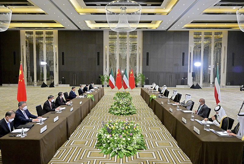 習近平強調,中方支持科方實施“2035國家愿景”,愿加強兩國發展戰略對接,積極參與科方重大項目建設,挖掘新能源、5G通信、數字經濟等領域合作潛力,支持文化交流合作。首屆中阿峰會和中海峰會是具有里程碑意義的大事,中方愿同科方一道,推動中阿和中海關系取得更大發展。中方祝賀科威特成為上海合作組織對話伙伴和亞信成員國,贊賞科方支持全球發展倡議,愿同科方在地區和國際事務中加強溝通和協調,為各國共同發展和普遍安全作出努力。