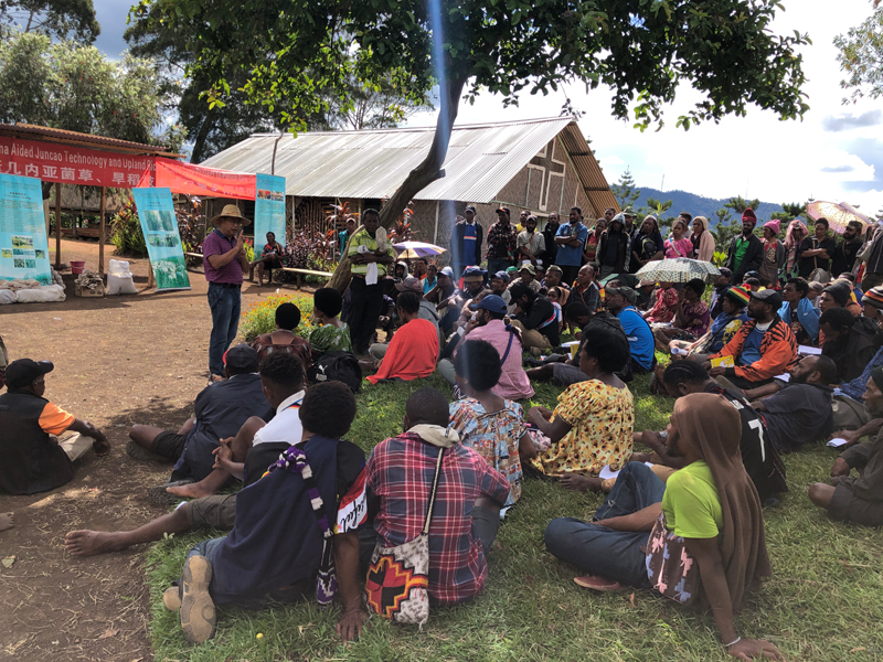 中國援巴布亞新幾內亞菌草旱稻項目專家組組長林應興(戴草帽者)在巴布亞新幾內亞東高地省中國援助巴新菌草和旱稻技術項目第9期培訓班上授課(2020年12月15日攝)。新華社發
