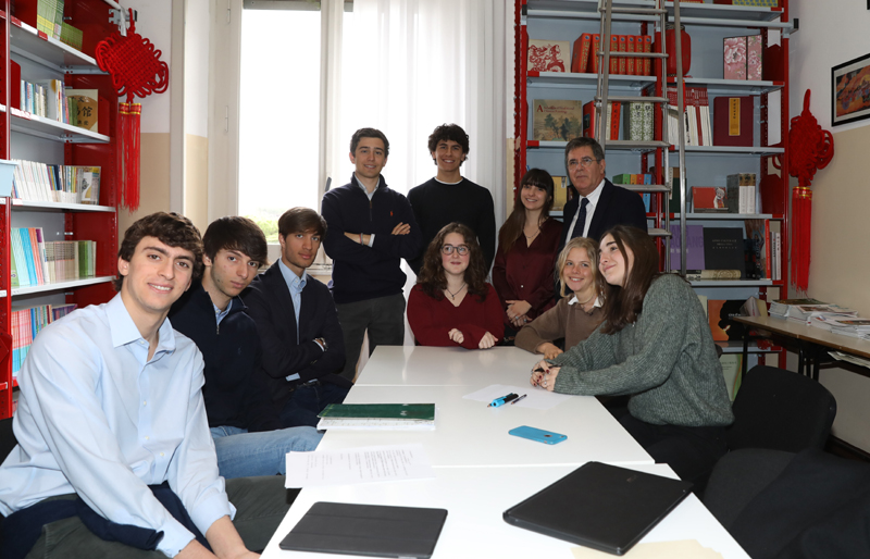 意大利羅馬國立住讀學校校長雷亞萊(后排右一)與致信習近平主席的學生們在一起(2019年3月18日攝)。新華社記者 程婷婷 攝