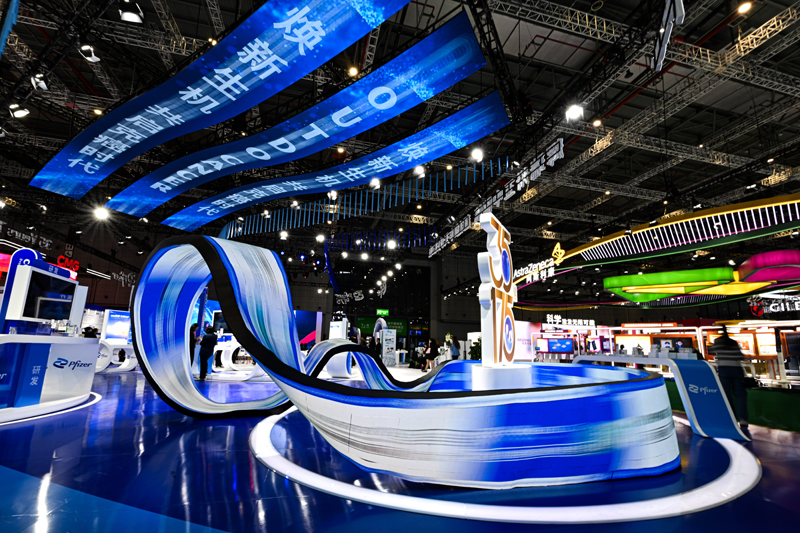這是2024年11月8日在第七屆進(jìn)博會(huì)醫(yī)療器械及醫(yī)藥保健展區(qū)拍攝的輝瑞展臺(tái)。新華社記者 辛悅衛(wèi) 攝