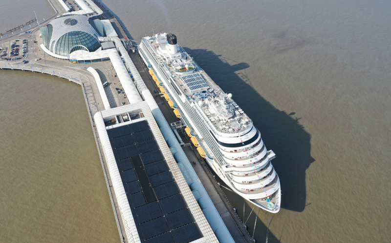 2024年1月1日,“愛(ài)達(dá)·魔都號(hào)”停靠在上海吳淞口國(guó)際郵輪港(無(wú)人機(jī)照片)。新華社記者 丁汀 攝