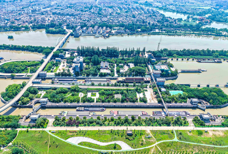 2025年7月4日,船舶有序通過京杭大運河揚州段邵伯船閘(無人機照片)。新華社發(任飛 攝)