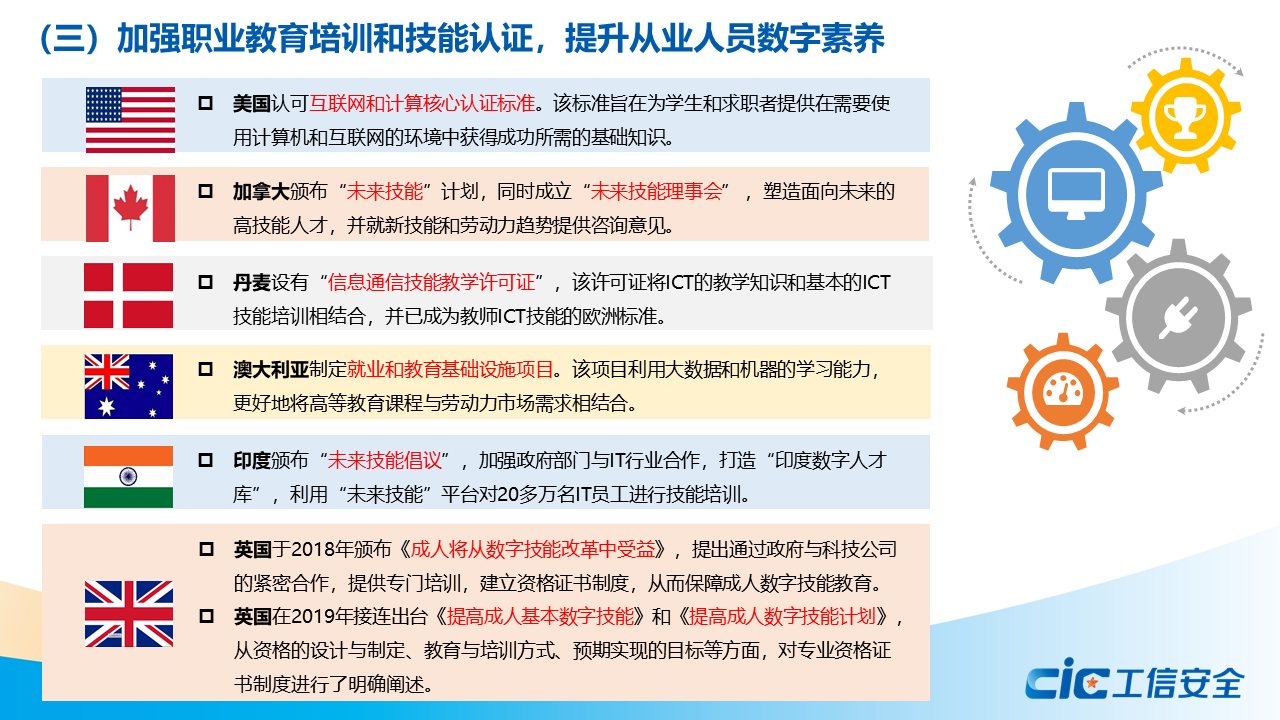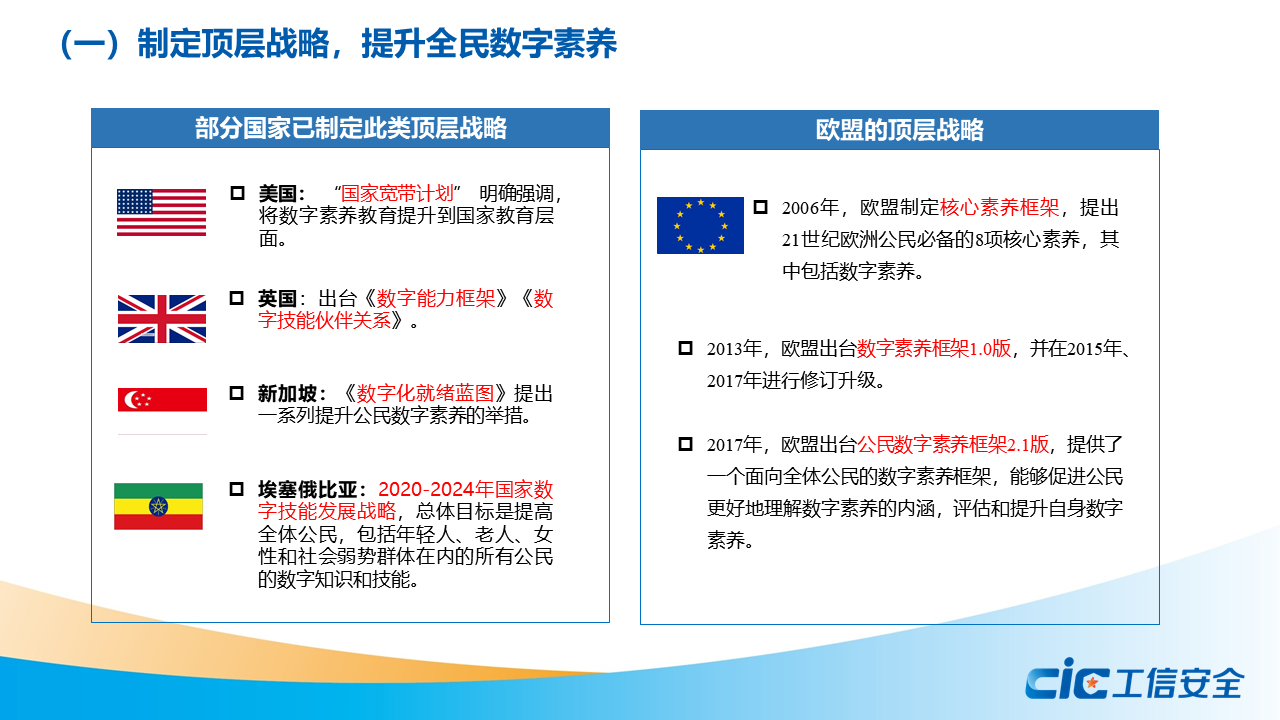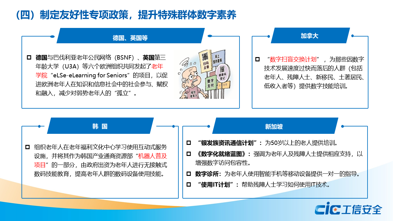 蔣艷指出,數字素養是數字經濟社會中公民工作生活學習應具備的數字獲取、制作、使用、評價、交互、分享、創新、安全保障、倫理道德等一系列素質與能力的集合。全球主要國家和地區紛紛制定頂層戰略,實施相關政策,開展數字教育專項行動,加強職業教育培訓和技能認證,推出面向特殊群體的友好性專項政策,提升全民數字素養。