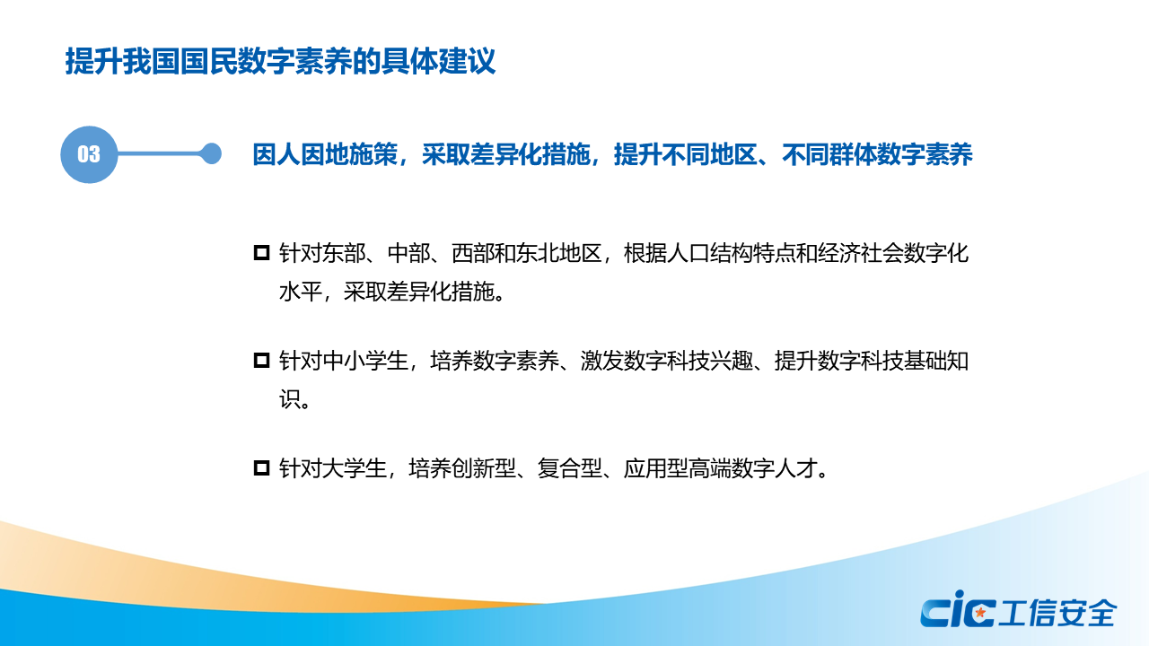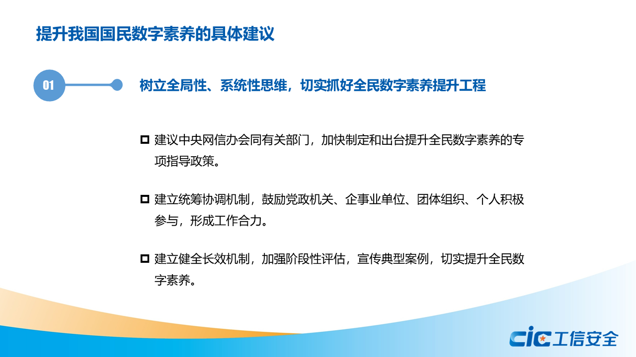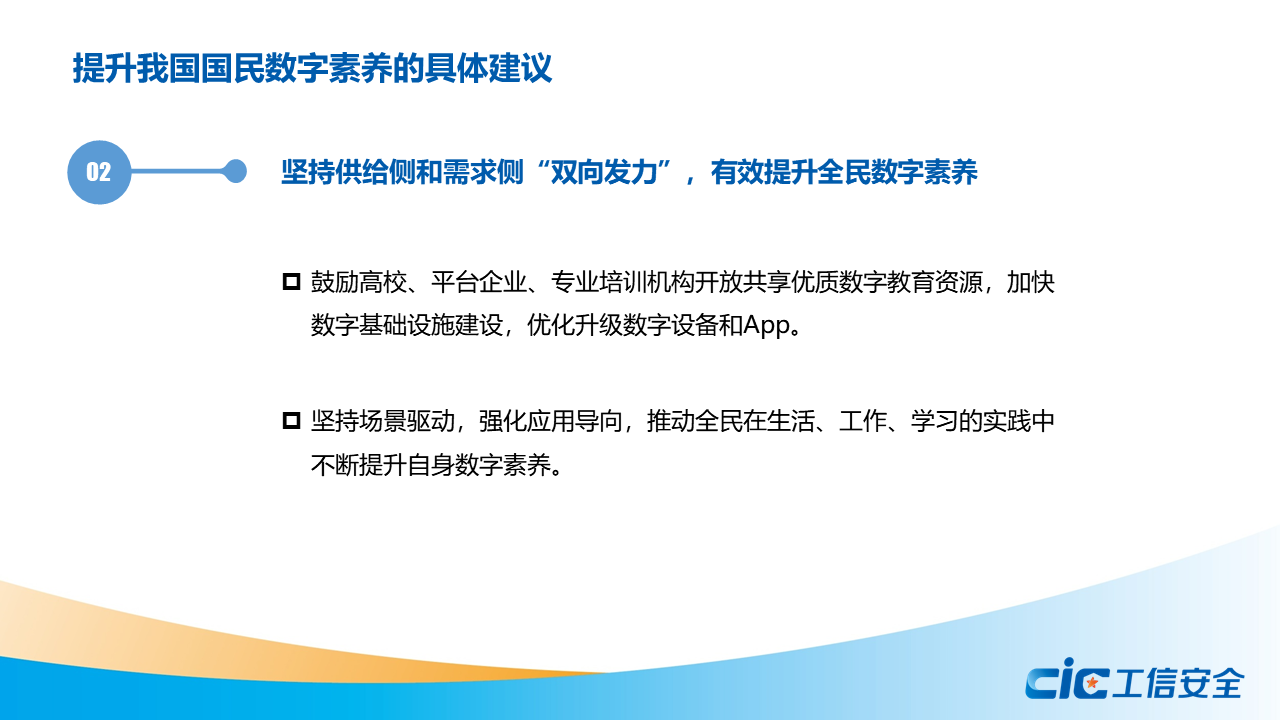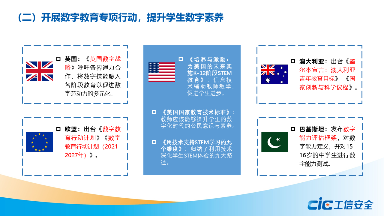 蔣艷指出,數字素養是數字經濟社會中公民工作生活學習應具備的數字獲取、制作、使用、評價、交互、分享、創新、安全保障、倫理道德等一系列素質與能力的集合。全球主要國家和地區紛紛制定頂層戰略,實施相關政策,開展數字教育專項行動,加強職業教育培訓和技能認證,推出面向特殊群體的友好性專項政策,提升全民數字素養。