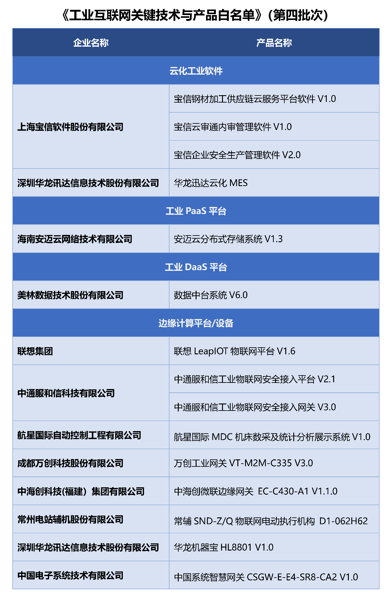 本批次入選《工業互聯網關鍵技術與產品白名單》的產品如下: