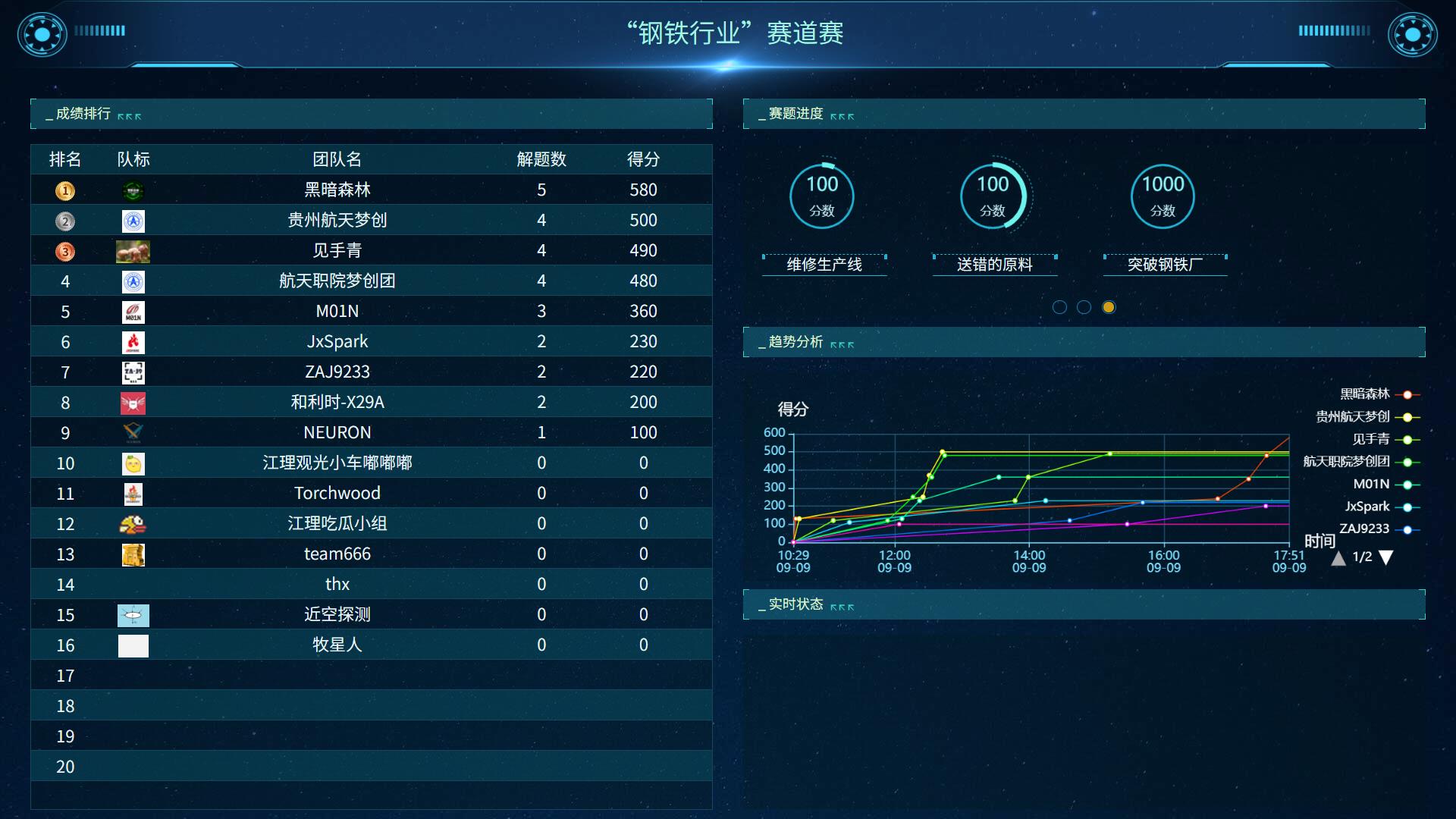 比賽開場后半小時左右“黑暗森林”戰隊很快便率先攻破一題,拿下了“鋼鐵行業”賽道賽的首分!“貴州航天夢創”戰隊緊隨其后,各參賽隊員都集中精力、全力以赴破解賽題,爭取為自己的隊伍在有限的比賽時間內可以最大化賽題破解數量,以取得優異的成績占據榜首位置!