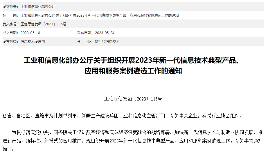 來源:工業(yè)和信息化部辦公廳關于組織開展2023年新一代信息技術典型產(chǎn)品、應用和服務案例遴選工作的通知