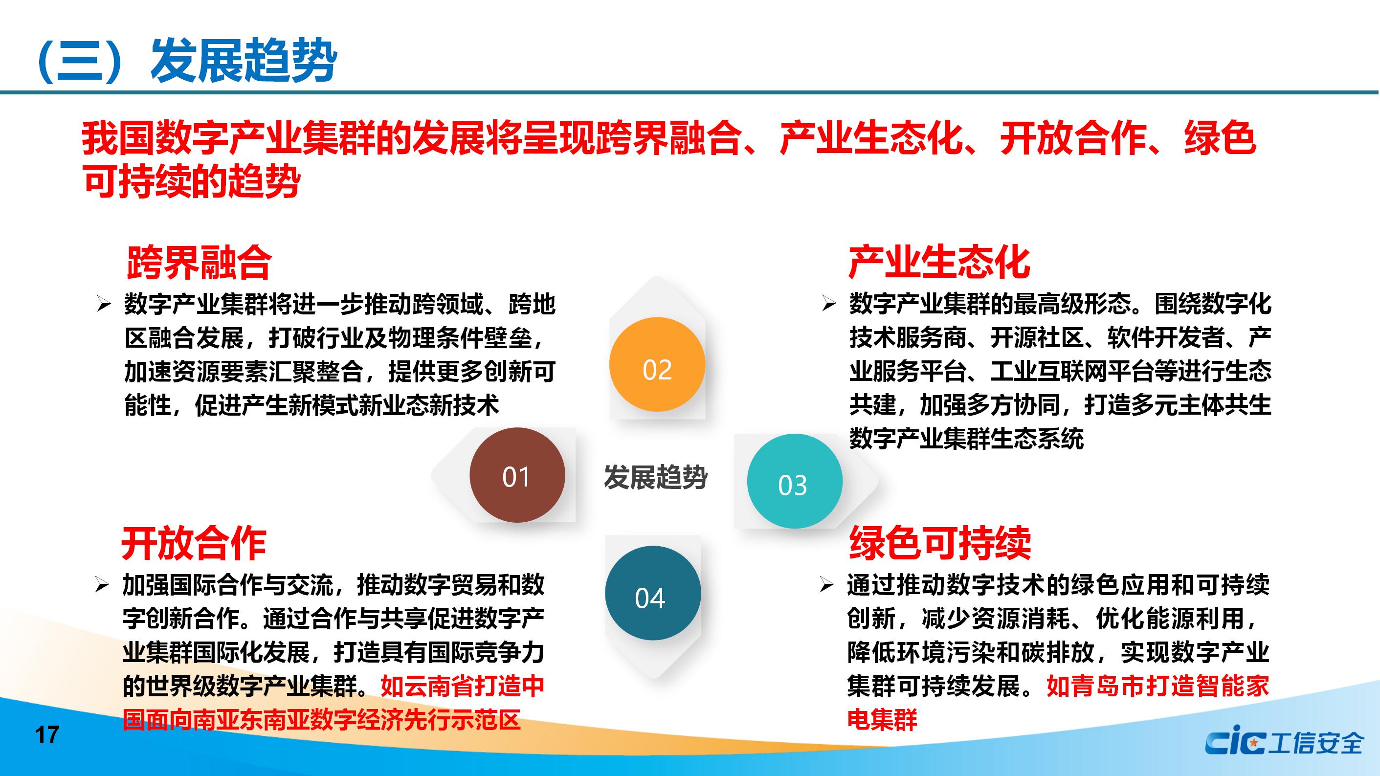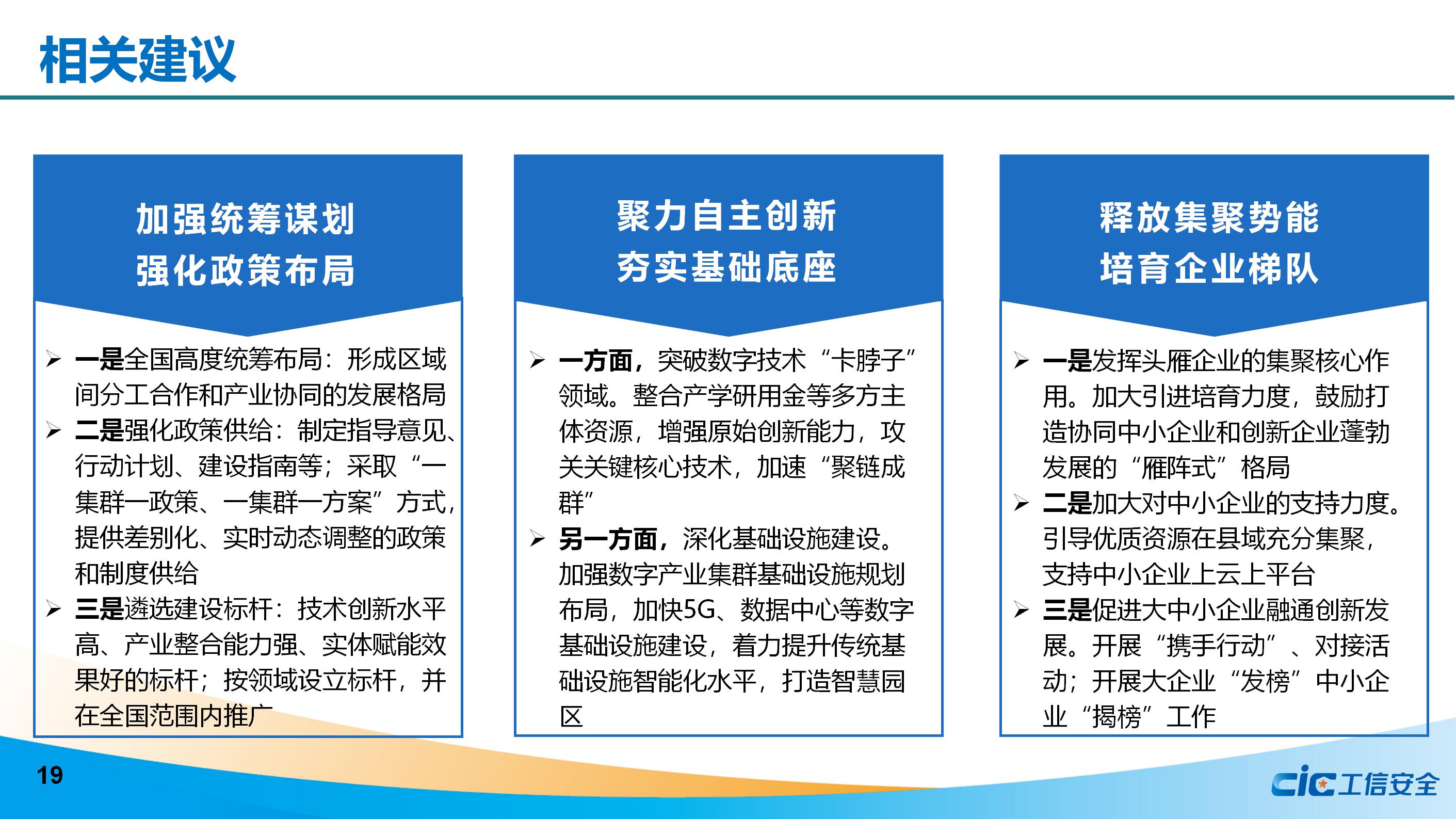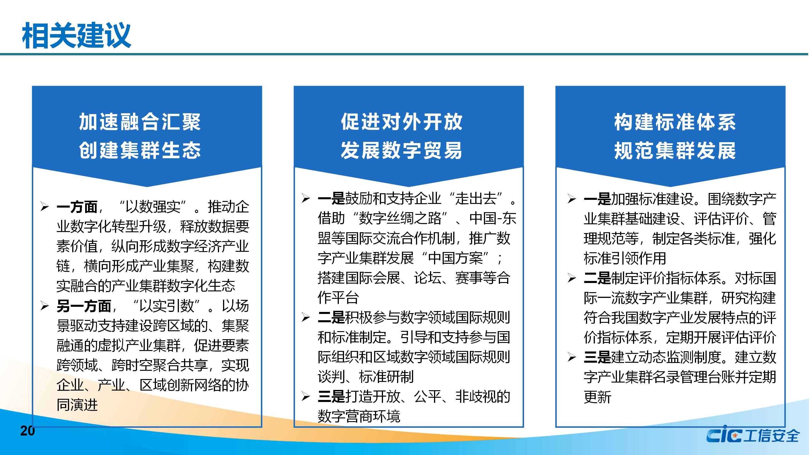 最后,《研究報告》提出加強統籌謀劃、強化政策布局,聚力自主創新、夯實基礎底座,釋放集聚勢能、培育企業梯隊,加速融合匯聚、創建集群生態,促進對外開放、發展數字貿易,構建標準體系、規范集群發展等措施,分階段分領域打造具有國際競爭力的數字產業集群。