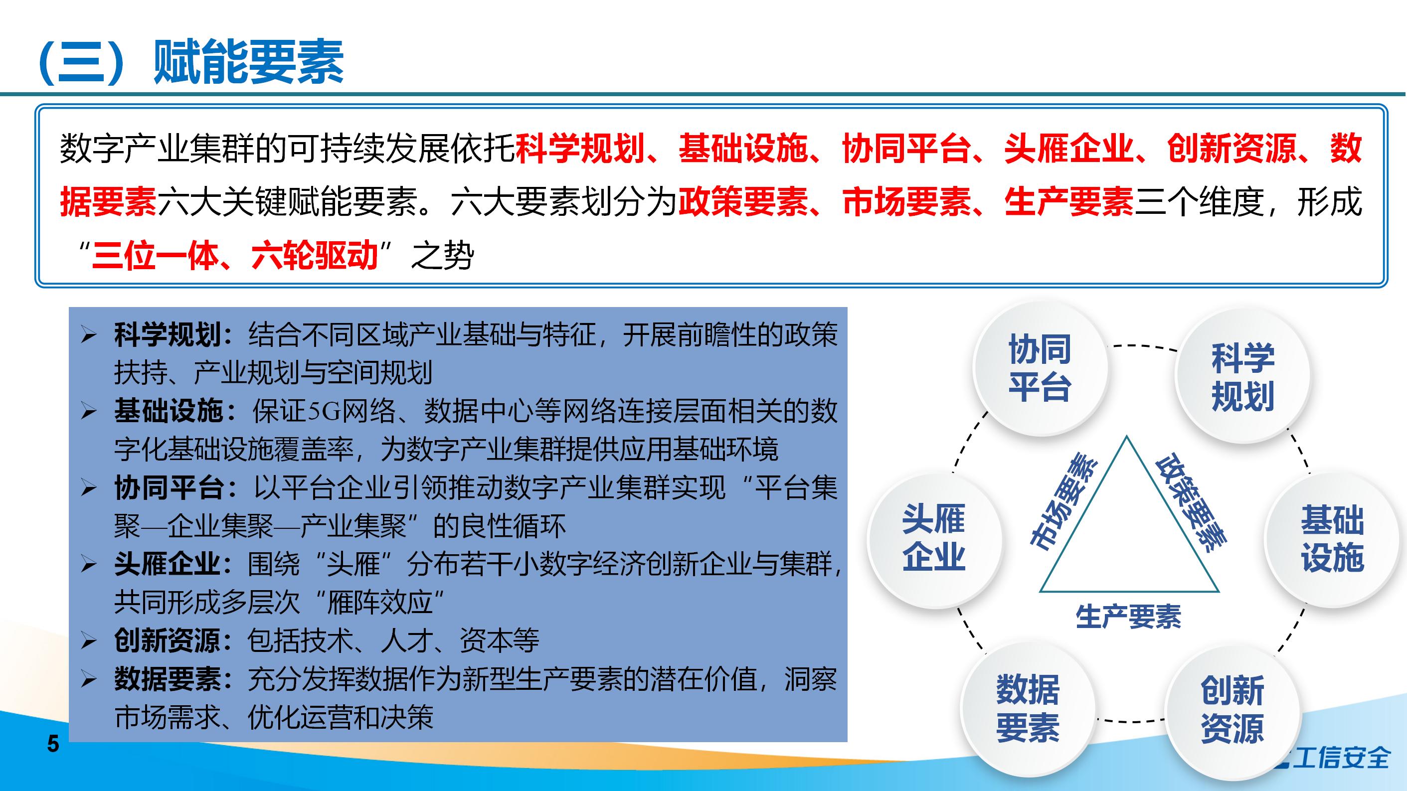 《研究報告》指出數字產業集群是以新發展理念為引領,從事數字產品制造、數字產品服務、數字技術應用、數字要素驅動、數字化效率提升的企業主體及其相關機構等組成的具有較強核心競爭力的企業集群。數字產業集群呈現跨界技術融合、數字平臺支撐、數據要素驅動、產業融通發展、虛擬資源配置、集群生態共建六大主要特征,其可持續發展依托科學規劃、基礎設施、協同平臺、頭雁企業、創新資源、數據要素六大關鍵賦能要素。