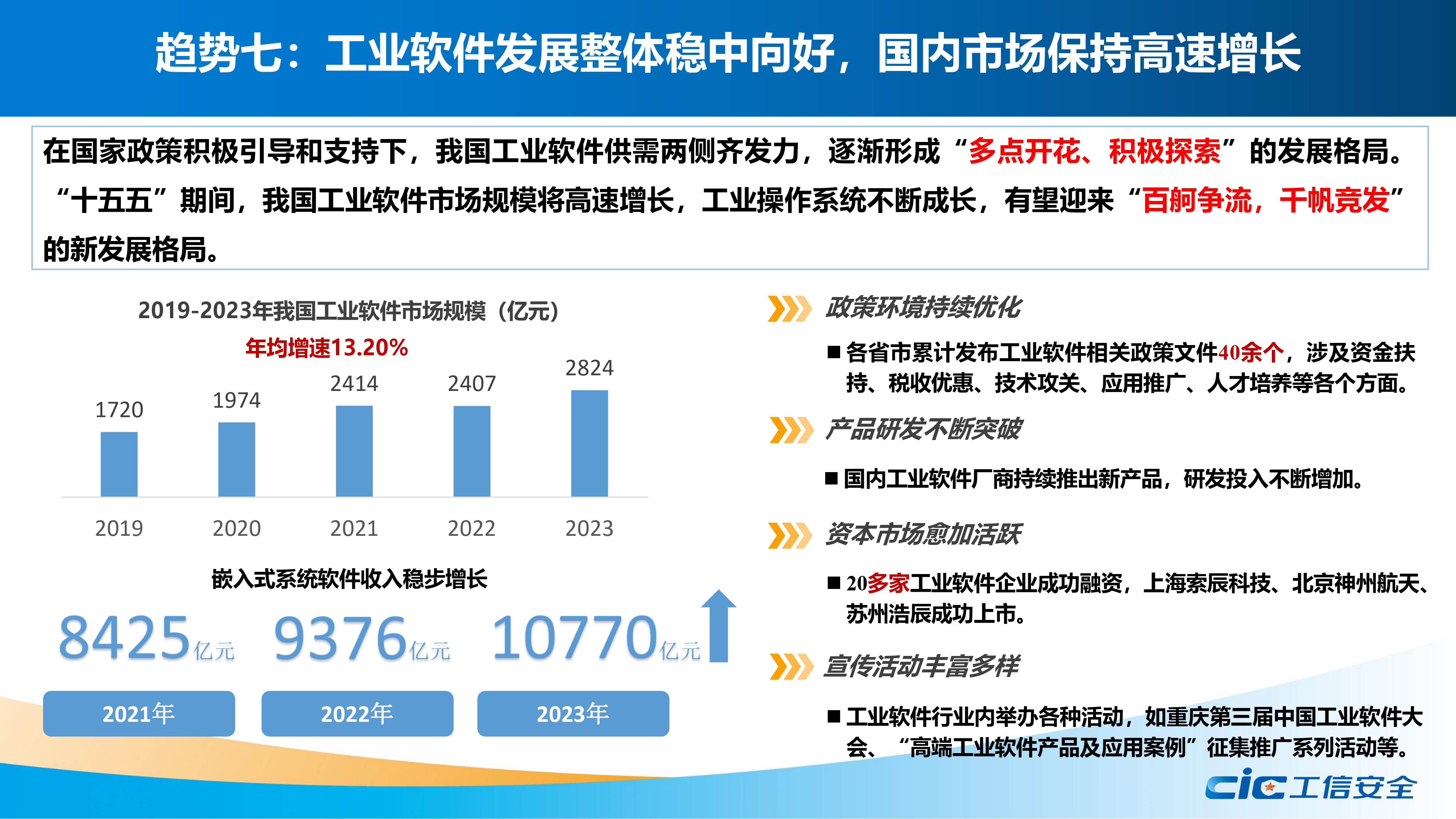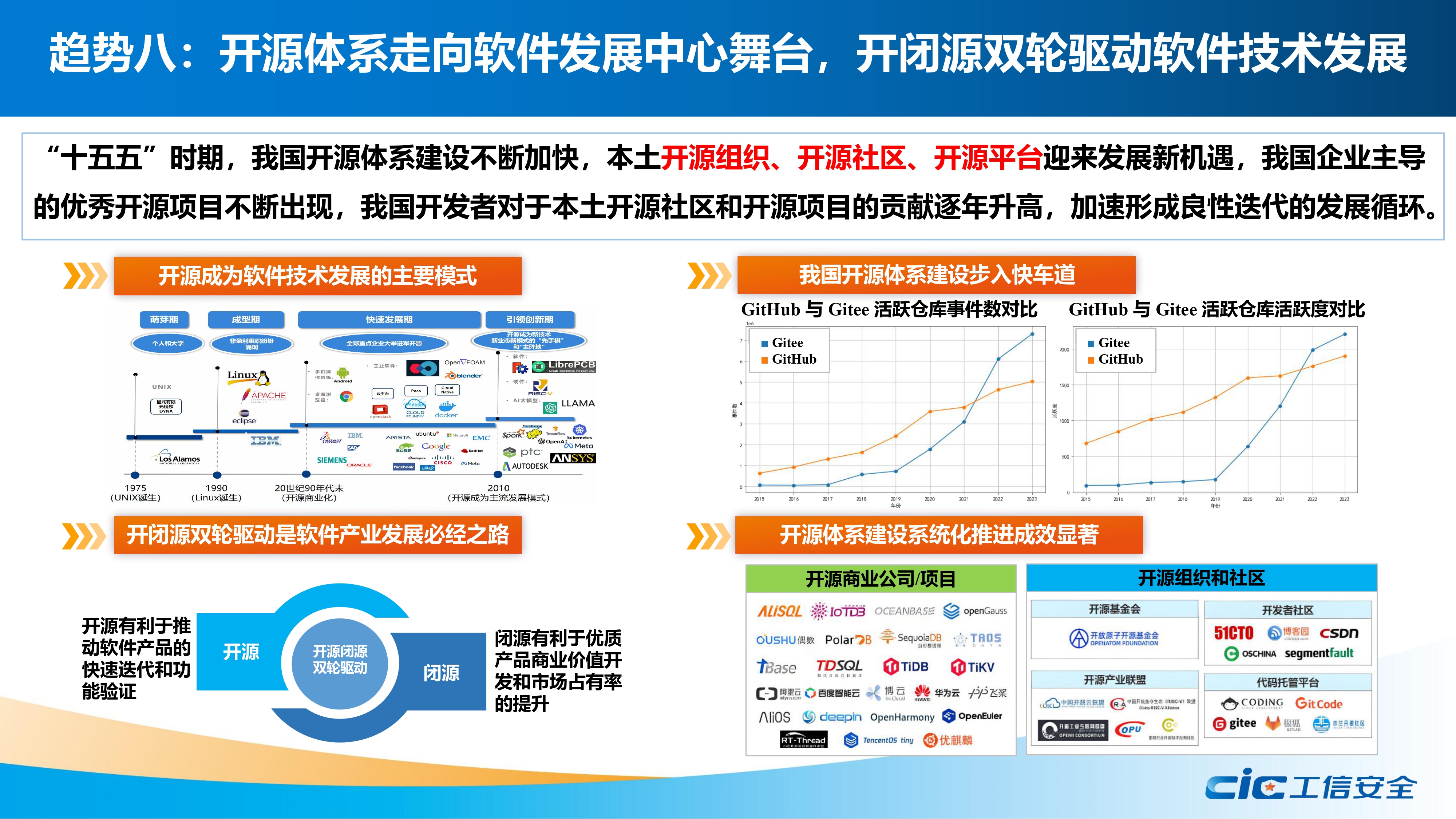 總體上看,在新型工業(yè)化需求拉動和技術創(chuàng)新驅(qū)動雙重作用下,我國軟件產(chǎn)業(yè)將持續(xù)做大做強,人工智能帶來重大發(fā)展機遇,云邊協(xié)同等新興技術應用走深走實,基礎軟件、工業(yè)軟件等關鍵軟件供給能力大幅提升,開閉源雙輪驅(qū)動發(fā)展格局逐漸成為主流,軟件供應鏈韌性和安全水平穩(wěn)步提高,軟件新質(zhì)生產(chǎn)力加速形成,將有力支撐數(shù)字經(jīng)濟高質(zhì)量發(fā)展,助力新型工業(yè)化偉大進程。