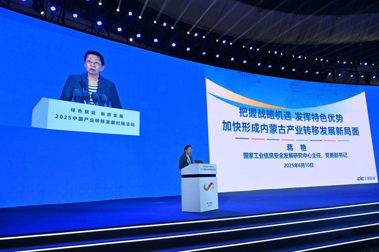 6月9-10日,2025中國產(chǎn)業(yè)轉(zhuǎn)移發(fā)展對(duì)接活動(dòng)(內(nèi)蒙古)在呼和浩特舉行。內(nèi)蒙古自治區(qū)黨委副書記、自治區(qū)人民政府主席王莉霞,工業(yè)和信息化部黨組成員、副部長單忠德出席開幕式并致辭。內(nèi)蒙古自治區(qū)黨委常委、自治區(qū)人民政府常務(wù)副主席黃志強(qiáng)主持開幕式并作產(chǎn)業(yè)推介。內(nèi)蒙古自治區(qū)黨委常委、呼和浩特市委書記包鋼出席活動(dòng)。國家工業(yè)信息安全發(fā)展研究中心(以下簡稱“中心”)主任、黨委副書記蔣艷在開幕式上作《把握戰(zhàn)略機(jī)遇 發(fā)揮特色優(yōu)勢(shì) 加快形成內(nèi)蒙古產(chǎn)業(yè)轉(zhuǎn)移發(fā)展新局面》主題發(fā)言。