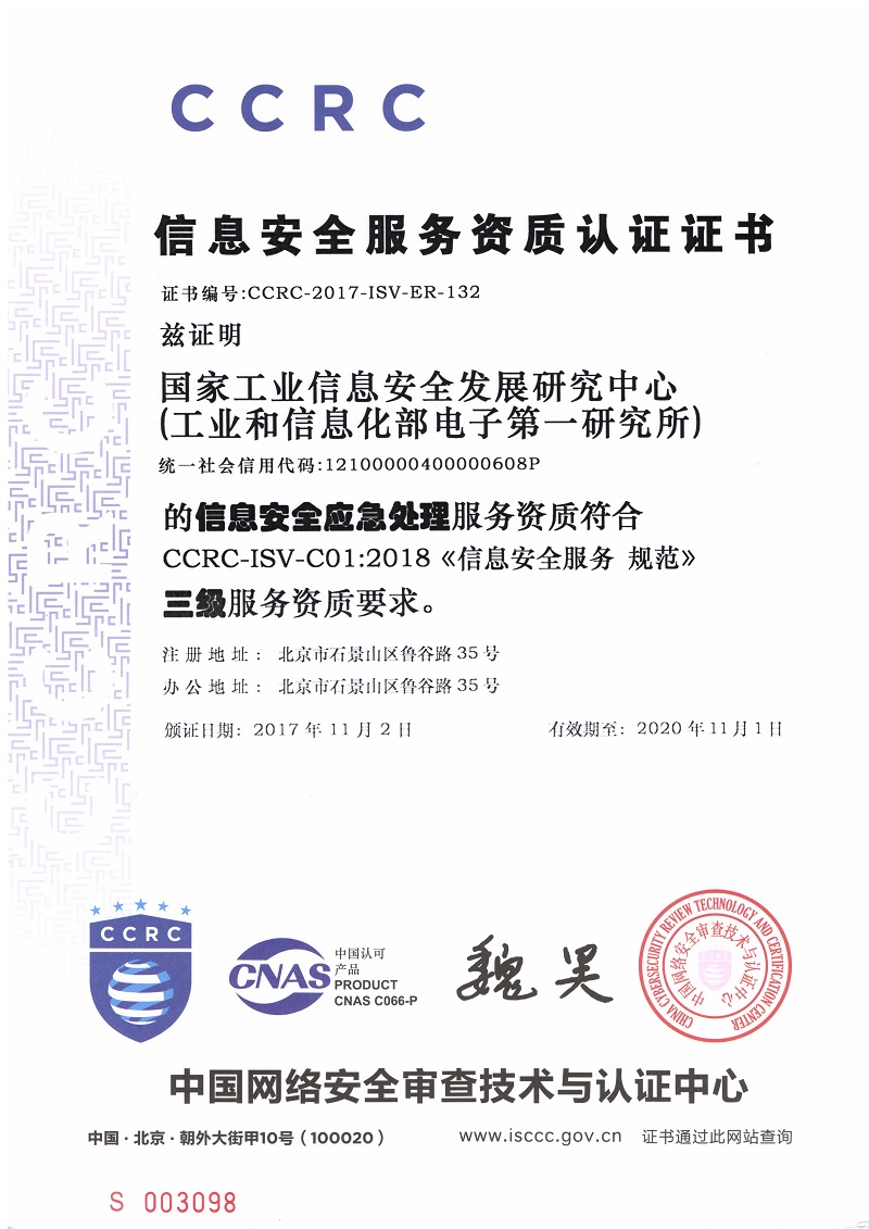 近日,國家工業信息安全發展研究中心(以下簡稱“國家工信安全中心”)順利通過中國網絡安全審查技術與認證中心的監審,獲得了信息安全應急處理三級服務資質認證證書。