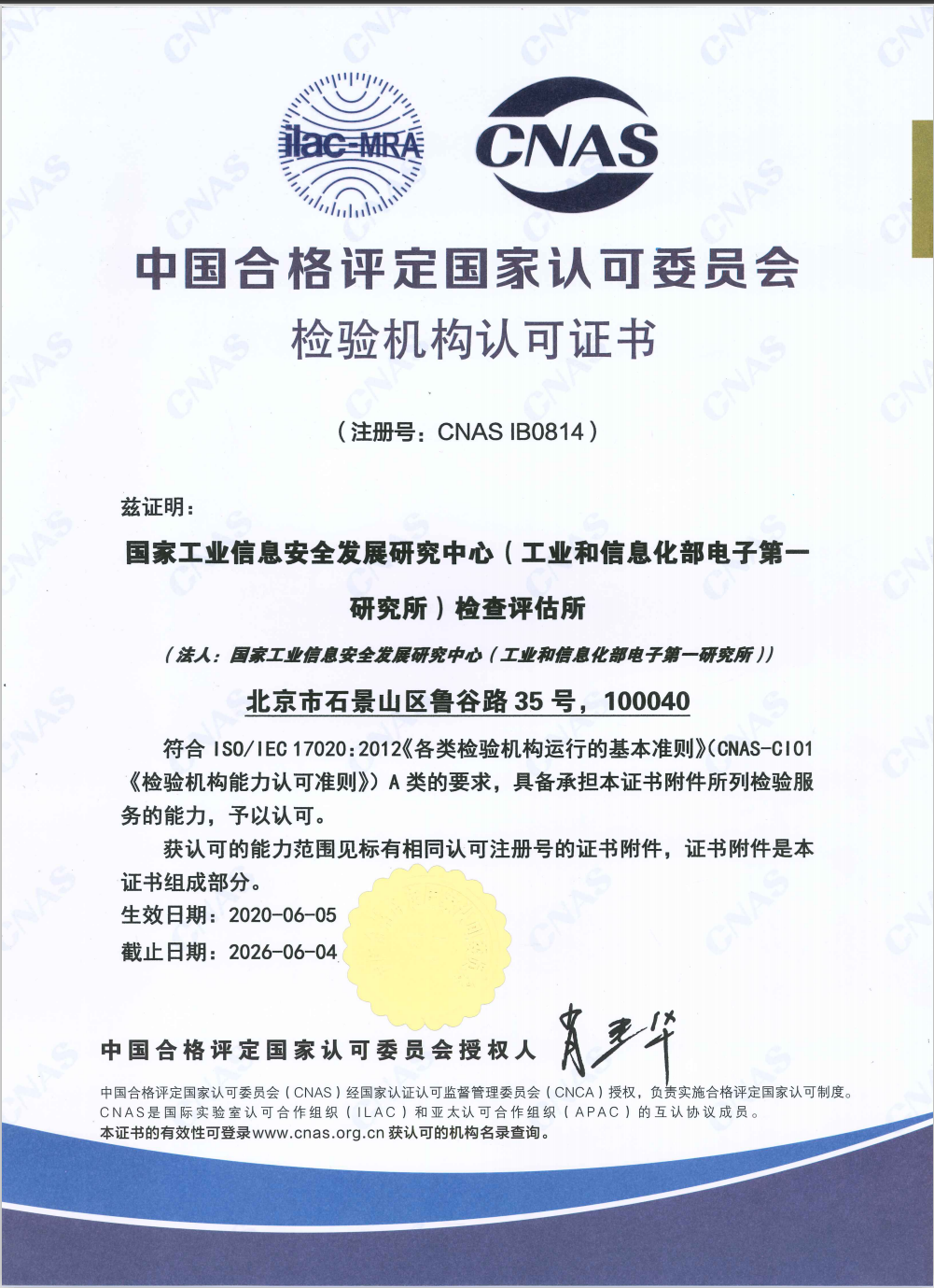 2020年6月15日,國家工業控制系統與產品安全質量監督檢驗中心(以下簡稱:國家工控安全質檢中心)順利取得由中國合格評定國家認可委員會(CNAS)批準授權的檢驗機構認可證書并成功擴項檢測技術能力。證書的獲取標志著國家工業信息安全發展研究中心首次取得信息安全風險評估和網絡安全等級保護兩個領域檢驗資質并成為信息安全領域國家級平臺檢驗機構之一。