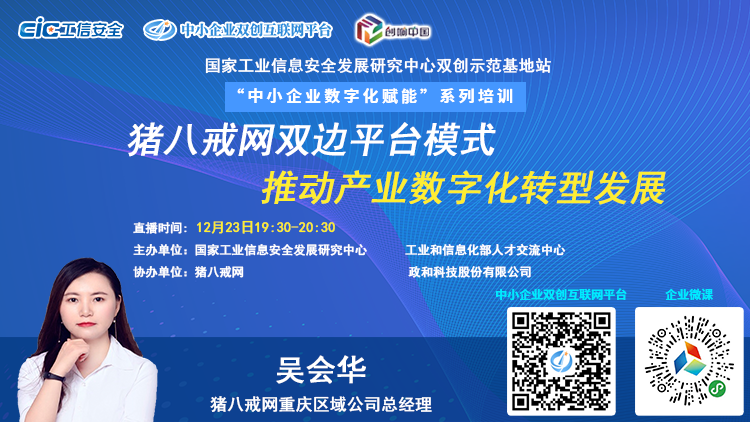12月23日,由國家工業信息安全發展研究中心聯合工業和信息化部人才交流中心推出的“中小企業數字化賦能”系列直播第十七期“豬八戒網雙邊平臺模式,推動產業數字化轉型發展”在線上舉行。