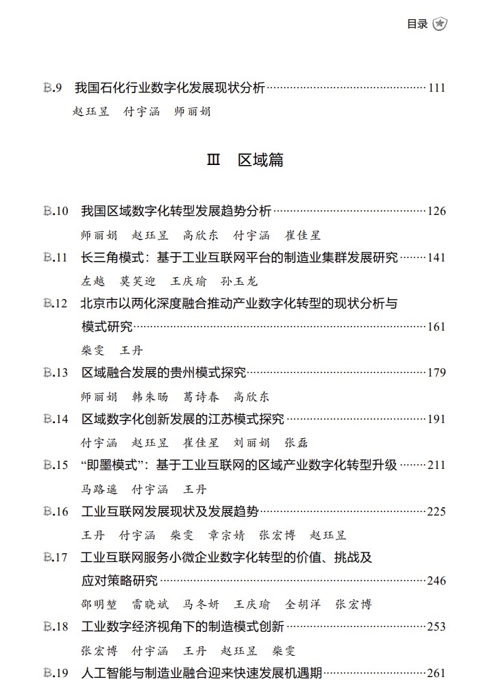 信息化所始終致力于兩化融合、制造業(yè)數(shù)字化轉(zhuǎn)型、工業(yè)大數(shù)據(jù)、工業(yè)互聯(lián)網(wǎng)等前沿領(lǐng)域研究。本年度報(bào)告深入分析了我國數(shù)字化轉(zhuǎn)型的發(fā)展現(xiàn)狀、重點(diǎn)方向、面臨挑戰(zhàn)及未來趨勢,主要從我國數(shù)字化轉(zhuǎn)型的重大戰(zhàn)略意義、總體發(fā)展情況、產(chǎn)業(yè)應(yīng)用實(shí)踐、區(qū)域特色化發(fā)展、重點(diǎn)領(lǐng)域探索創(chuàng)新等方面,總結(jié)歸納了近年來我國數(shù)字化轉(zhuǎn)型的主要進(jìn)展,并對(duì)未來發(fā)展趨勢進(jìn)行研判與展望,著重研究了汽車、紡織、石化等行業(yè)的轉(zhuǎn)型發(fā)展現(xiàn)狀,分析了長三角、北京市、貴州省、江蘇省、青島市即墨區(qū)等省市區(qū)域的轉(zhuǎn)型發(fā)展模式,梳理了工業(yè)互聯(lián)網(wǎng)、人工智能、衛(wèi)星互聯(lián)網(wǎng)等專題領(lǐng)域的發(fā)展情況。