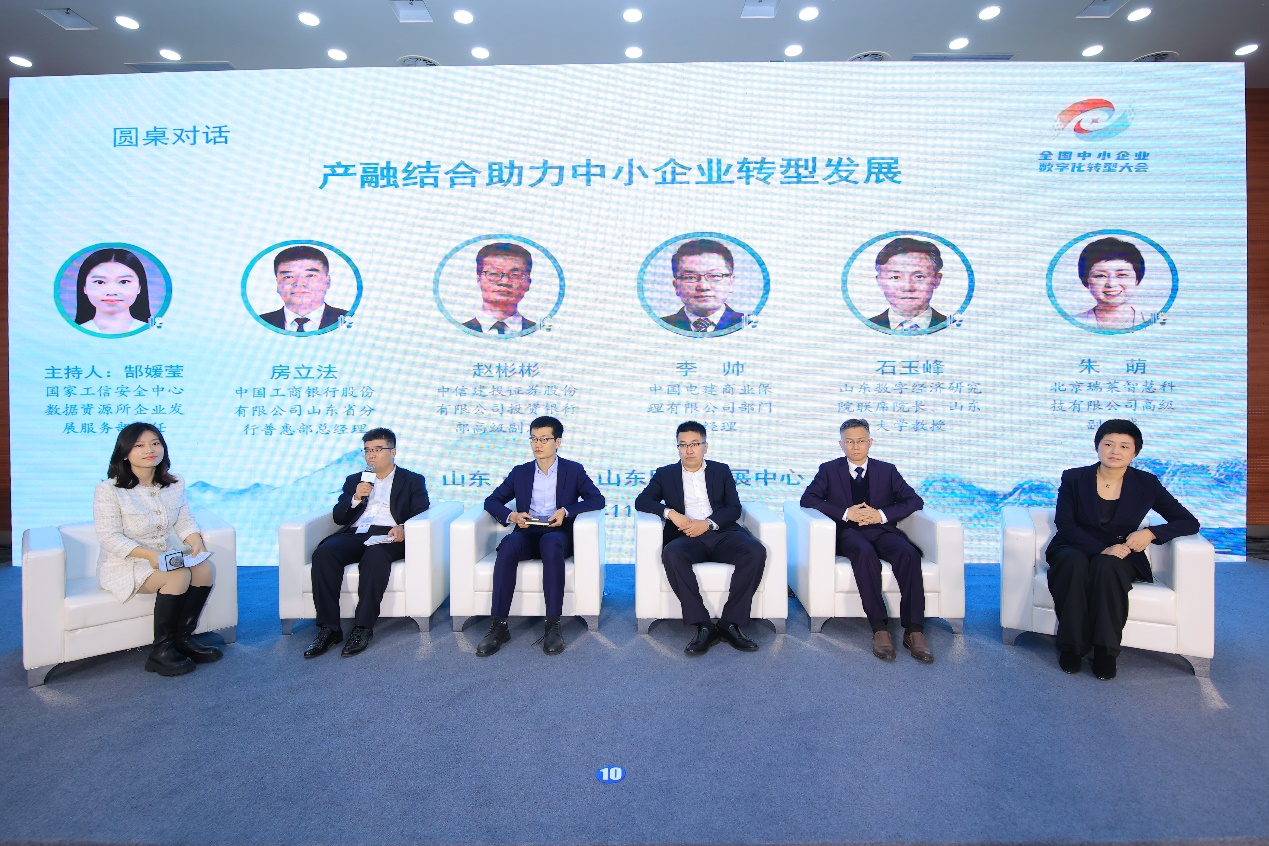圓桌對話環節由中心數據資源所企業發展部主任郜媛瑩主持。來自中國工商銀行股份有限公司山東省分行、中信建投證券股份有限公司、中國電建商業保理有限公司、山東數字經濟研究院、北京瑞萊智慧科技有限公司的代表匯聚一堂,圍繞產融結合助力數字化轉型穩步推進這一主題,共同探討不同角度產融結合助力中小企業轉型發展的策略及路徑。