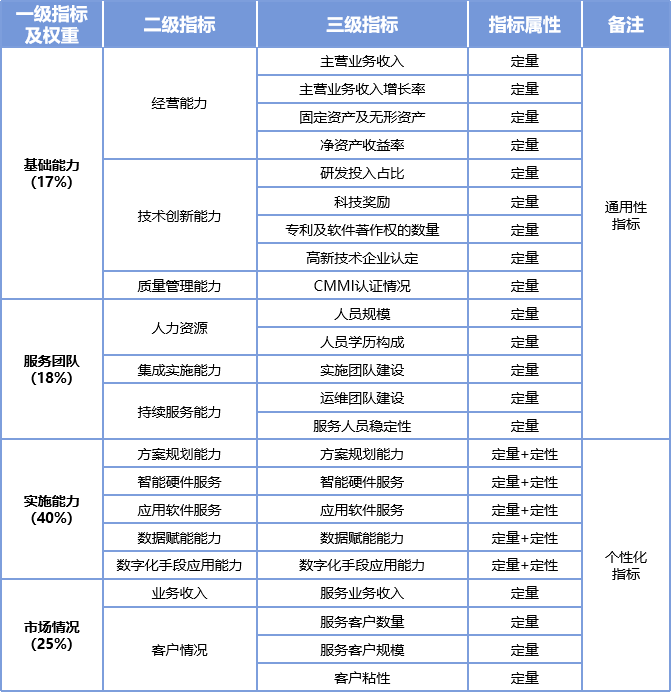 《報告》按照汽車行業企業數字化轉型的主要業務領域及重點需求,將服務商分為研發、生產、供應鏈、銷售、服務5個大類,并提出了涵蓋基礎能力、服務團隊、實施能力、市場情況4個一級指標、13個二級指標、23個三級指標的汽車行業數字化轉型服務商能力評價體系。