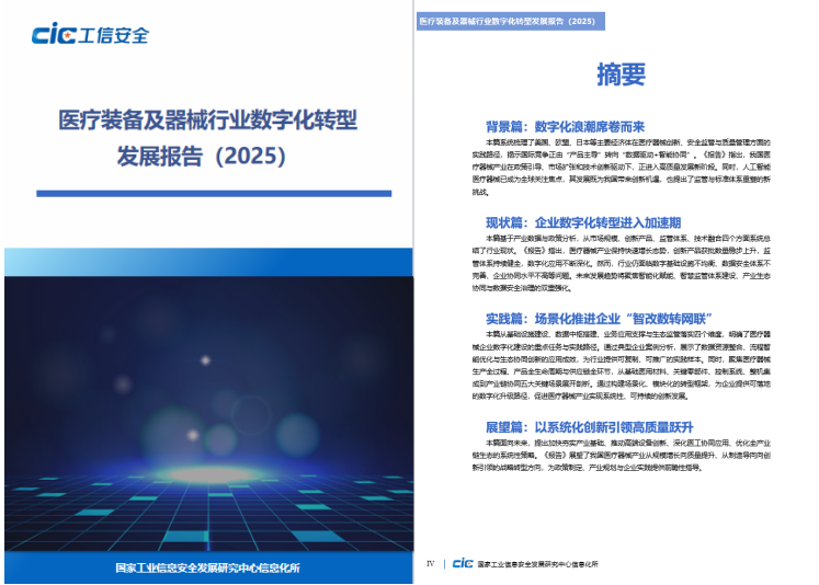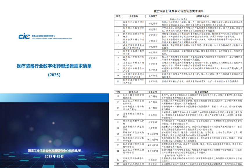12月9日,在遼寧沈陽召開的2025年兩化融合暨數字化轉型大會“醫療裝備及器械行業數字化轉型供需對接專題活動”上,由國家工業信息安全發展研究中心編制的《醫療裝備行業數字化轉型場景圖譜》《醫療裝備行業數字化轉型場景需求清單》《醫療裝備及器械行業數字化轉型發展報告(2025)》三項核心成果重磅發布。
