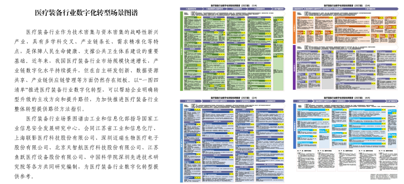 醫療裝備作為首批“場景圖譜”建設的行業之一,《醫療裝備行業數字化轉型場景圖譜》圍繞基礎材料、基礎零部件、軟件系統、總裝測試、用戶服務五大核心環節,梳理醫用材料、醫療芯片、智能傳感器數字化研發,以及智能檢測、協同裝備等117個典型場景,全面覆蓋診斷類、治療類、生命維持急救類等裝備及器械數字化轉型實踐,為行業數字化轉型提供系統“參考指引”。