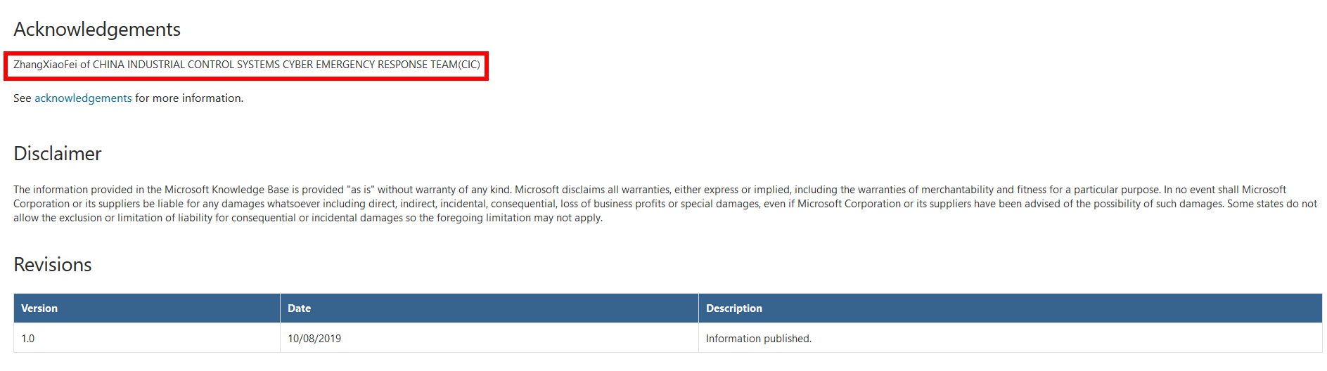 2019年10月9日,微軟官方發(fā)布了補(bǔ)丁更新公告,公開致謝國家工業(yè)信息安全發(fā)展研究中心的研究人員。