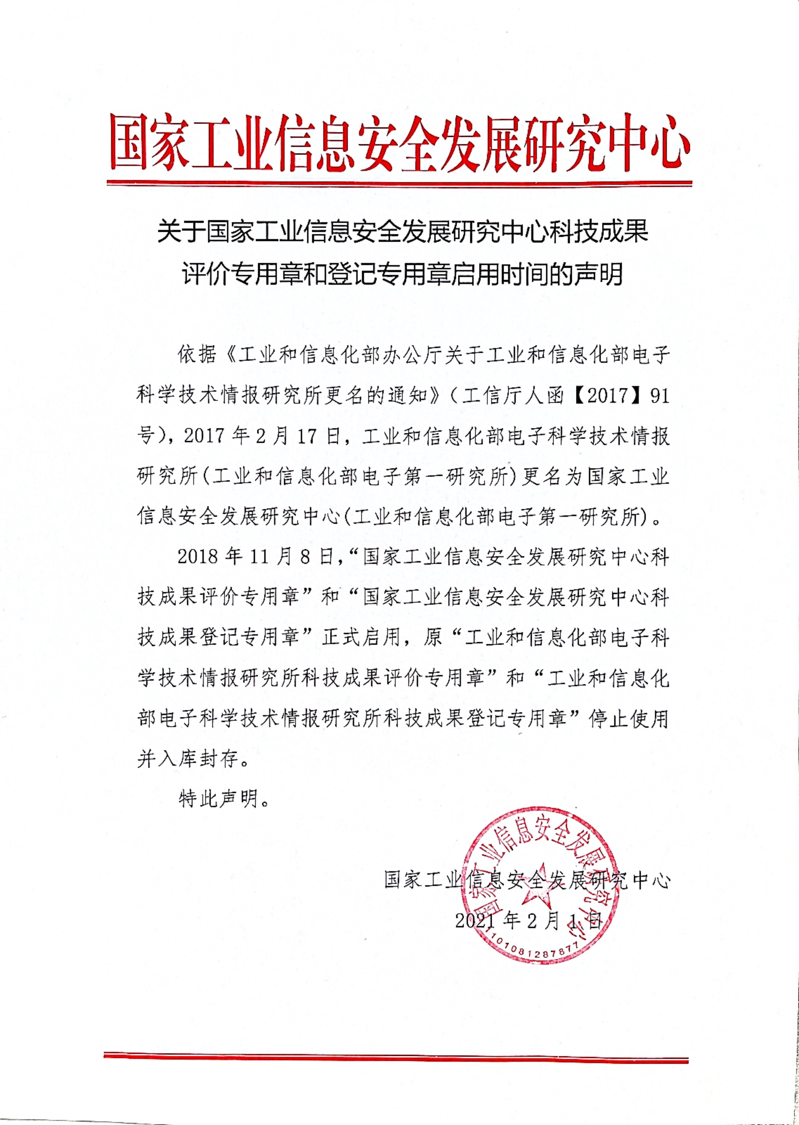 關于中心科技成果評價和登記專用章啟用時間的聲明