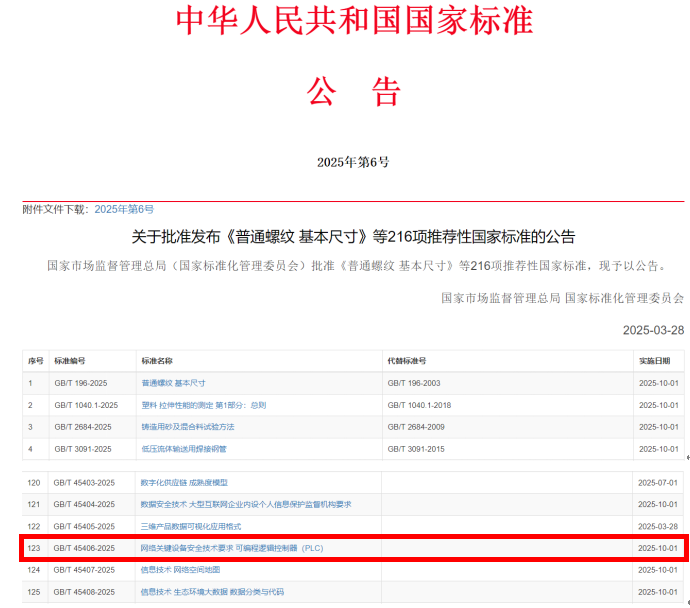 3月28日,國家市場監督管理總局(國家標準化管理委員會)發布2025年第6號中國國家標準公告,批準GB/T 45406-2025 《網絡關鍵設備安全技術要求 可編程邏輯控制器(PLC)》國家標準正式發布。該標準由全國網絡安全標準化技術委員會(TC260)歸口管理,由國家工業信息安全發展研究中心牽頭組織龍頭企業、服務機構、科研院所和高等院校共同研制,積極響應了國家關于加強網絡關鍵設備安全保障、工業控制系統安全等相關政策要求。該標準進一步落實了《網絡安全法》第二十三條中關于“網絡關鍵設備和網絡安全專用產品應當按照相關國家標準的強制性要求,由具備資格的機構安全認證合格或者安全檢測符合要求后,方可銷售或者提供”的具體要求,為進一步落實國家對工業控制系統網絡安全的監管要求,助力構建新型工業化安全保障體系奠定基礎?。