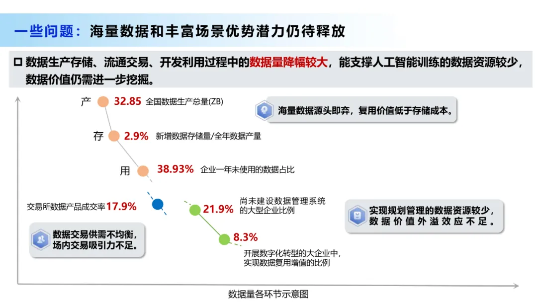同時發(fā)現(xiàn),我國海量數(shù)據(jù)和豐富場景優(yōu)勢潛力亟需釋放。一是海量數(shù)據(jù)源頭即棄。2023年,全國新增數(shù)據(jù)存儲量為0.95澤字節(jié)(ZB),生產(chǎn)總量中僅有2.9%的數(shù)據(jù)被保存。一方面由于海量數(shù)據(jù)復用價值較低,大部分過程類數(shù)據(jù)產(chǎn)生后即被丟棄或覆蓋。另一方面,由于目前大模型、訓練工具等支撐能力不足,海量數(shù)據(jù)開發(fā)利用價值低于存儲成本。二是數(shù)據(jù)存而未用現(xiàn)象較為突出。企業(yè)一年未使用的數(shù)據(jù)占比約四成,數(shù)據(jù)加工能力不足導致大量數(shù)據(jù)價值被低估、難以挖掘復用。隨著各行業(yè)各領域對智能算力的需求日趨強烈,大模型與國產(chǎn)軟硬件的適配性問題尚需解決。三是數(shù)據(jù)價值外溢效應不足。開展數(shù)字化轉型的大企業(yè)中,實現(xiàn)數(shù)據(jù)復用增值的為8.3%,實現(xiàn)規(guī)劃管理的企業(yè)數(shù)據(jù)資源較少,數(shù)據(jù)價值有待釋放。