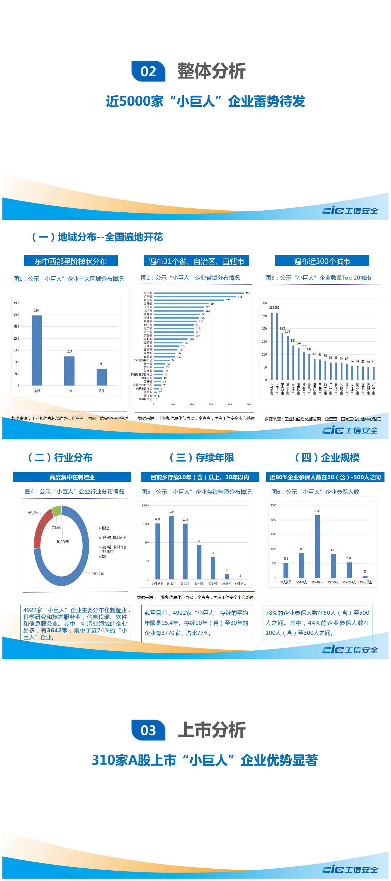 報告對我國公示的4922家專精特新“小巨人”企業進行了全面分析,并進一步聚焦310家在A股上市的“小巨人”企業,依據其披露的財務數據做了更深入的分析,發現這些企業具有分布集中、低市值、高成長、高盈利、高估值、創新能力強的顯著特征和優勢。同時,結合我國“小巨人”企業的發展實際,梳理了目前培育及發展“專精特新”企業中還存在的一些問題,并提出了相應的政策建議。