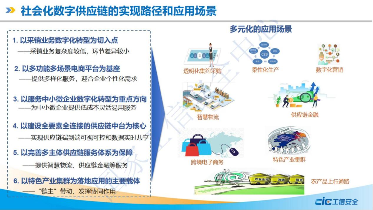 10月23日,在大灣區(qū)(深圳)數(shù)字供應(yīng)鏈峰會(huì)暨第三屆中國(guó)工業(yè)電子商務(wù)大會(huì)上,國(guó)家工業(yè)信息安全發(fā)展研究中心副主任何小龍發(fā)布《社會(huì)化數(shù)字供應(yīng)鏈全景圖》研究報(bào)告。 報(bào)告指出,在新興數(shù)字技術(shù)、平臺(tái)和解決方案的“組合拳”作用下,供應(yīng)鏈不再囿于單純的企業(yè)業(yè)務(wù)范疇,而是加快向數(shù)字化、社會(huì)化、生態(tài)化演進(jìn)。 報(bào)告首次對(duì)社會(huì)化數(shù)字供應(yīng)鏈的概念內(nèi)涵作了界定,認(rèn)為社會(huì)化數(shù)字供應(yīng)鏈?zhǔn)怯啥嘣黧w參與的,通過供應(yīng)鏈全流程數(shù)據(jù)共享和價(jià)值挖掘賦能行業(yè)和企業(yè),在此過程中所形成的一種“線上+線下”“物理+數(shù)字”的新型基礎(chǔ)設(shè)施和生產(chǎn)流通組織形態(tài)。 報(bào)告分別從技術(shù)和業(yè)務(wù)視角總結(jié)了社會(huì)化數(shù)字供應(yīng)鏈的六大要素,即數(shù)字技術(shù)、平臺(tái)中樞、智能算法以及多元主體、彈性網(wǎng)絡(luò)和云化業(yè)務(wù)。與傳統(tǒng)供應(yīng)鏈相比,社會(huì)化數(shù)字供應(yīng)鏈體現(xiàn)出數(shù)字化、可視化、社會(huì)化、彈性化、全場(chǎng)景及普惠化等六大特征。 報(bào)告認(rèn)為,加快社會(huì)化數(shù)字供應(yīng)鏈發(fā)展,不僅是當(dāng)前打造數(shù)字化流通新基建,賦能中小微企業(yè)“新基石”,更是關(guān)乎產(chǎn)業(yè)鏈供應(yīng)鏈穩(wěn)定和“雙循環(huán)”大局的“先手棋”。 從實(shí)踐來看,供應(yīng)鏈數(shù)字化轉(zhuǎn)型一般先從營(yíng)銷、采購等交易環(huán)節(jié)切入,逐步向供應(yīng)鏈全環(huán)節(jié)拓展,越來越多的數(shù)字技術(shù)已經(jīng)在供應(yīng)鏈中找到了落地場(chǎng)景,我國(guó)整體處于起步階段。工業(yè)電子商務(wù)平臺(tái)既是推動(dòng)數(shù)字供應(yīng)鏈發(fā)展的先行者,也成為助力傳統(tǒng)產(chǎn)業(yè)數(shù)字化轉(zhuǎn)型的使能者。 報(bào)告結(jié)合1688等平臺(tái)的典型做法,詳細(xì)展示了社會(huì)化數(shù)字供應(yīng)鏈的八類具體場(chǎng)景和用例。一是透明化集約采購有效降低企業(yè)成本,二是基于柔性生產(chǎn)的C2M模式讓按需定制成為可能,三是全渠道數(shù)字化營(yíng)銷創(chuàng)造廣闊市場(chǎng)空間,四是智慧物流全面提升供應(yīng)鏈效率,五是供應(yīng)鏈金融破解中小微企業(yè)融資難融資貴困局,六是跨境電商賦能企業(yè)提升企業(yè)供應(yīng)鏈全球化運(yùn)營(yíng)能力,七是打造特色產(chǎn)業(yè)集群強(qiáng)化產(chǎn)業(yè)鏈協(xié)作能力,八是構(gòu)建農(nóng)產(chǎn)品上行通路帶動(dòng)縣域經(jīng)濟(jì)發(fā)展。 當(dāng)前,社會(huì)化數(shù)字供應(yīng)鏈正推動(dòng)相關(guān)環(huán)節(jié)數(shù)字化走向縱深。然而,相對(duì)采銷環(huán)節(jié)數(shù)字化,要實(shí)現(xiàn)供應(yīng)鏈上下游主體間數(shù)據(jù)共享與協(xié)同的阻力更大、難度更高、進(jìn)展更緩慢,需要從供給側(cè)、應(yīng)用側(cè)、要素資源、生態(tài)體系和發(fā)展環(huán)境等方面共同發(fā)力,突破瓶頸。 下一步,中心將對(duì)社會(huì)化數(shù)字供應(yīng)鏈理論和實(shí)踐進(jìn)行更深入的跟蹤研究,也誠摯歡迎社會(huì)各界參與我們的交流和探討。