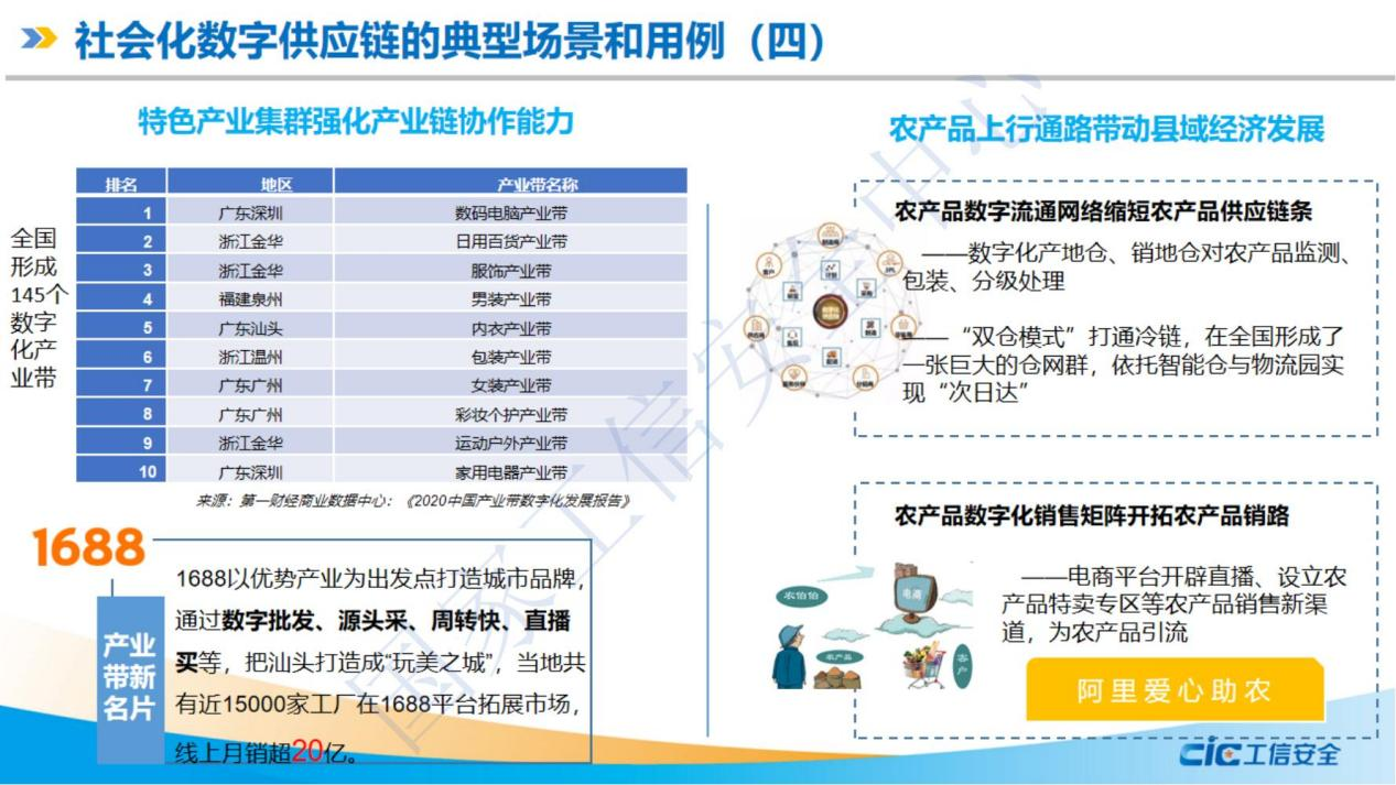 報(bào)告結(jié)合1688等平臺(tái)的典型做法,詳細(xì)展示了社會(huì)化數(shù)字供應(yīng)鏈的八類具體場(chǎng)景和用例。一是透明化集約采購有效降低企業(yè)成本,二是基于柔性生產(chǎn)的C2M模式讓按需定制成為可能,三是全渠道數(shù)字化營(yíng)銷創(chuàng)造廣闊市場(chǎng)空間,四是智慧物流全面提升供應(yīng)鏈效率,五是供應(yīng)鏈金融破解中小微企業(yè)融資難融資貴困局,六是跨境電商賦能企業(yè)提升企業(yè)供應(yīng)鏈全球化運(yùn)營(yíng)能力,七是打造特色產(chǎn)業(yè)集群強(qiáng)化產(chǎn)業(yè)鏈協(xié)作能力,八是構(gòu)建農(nóng)產(chǎn)品上行通路帶動(dòng)縣域經(jīng)濟(jì)發(fā)展。
