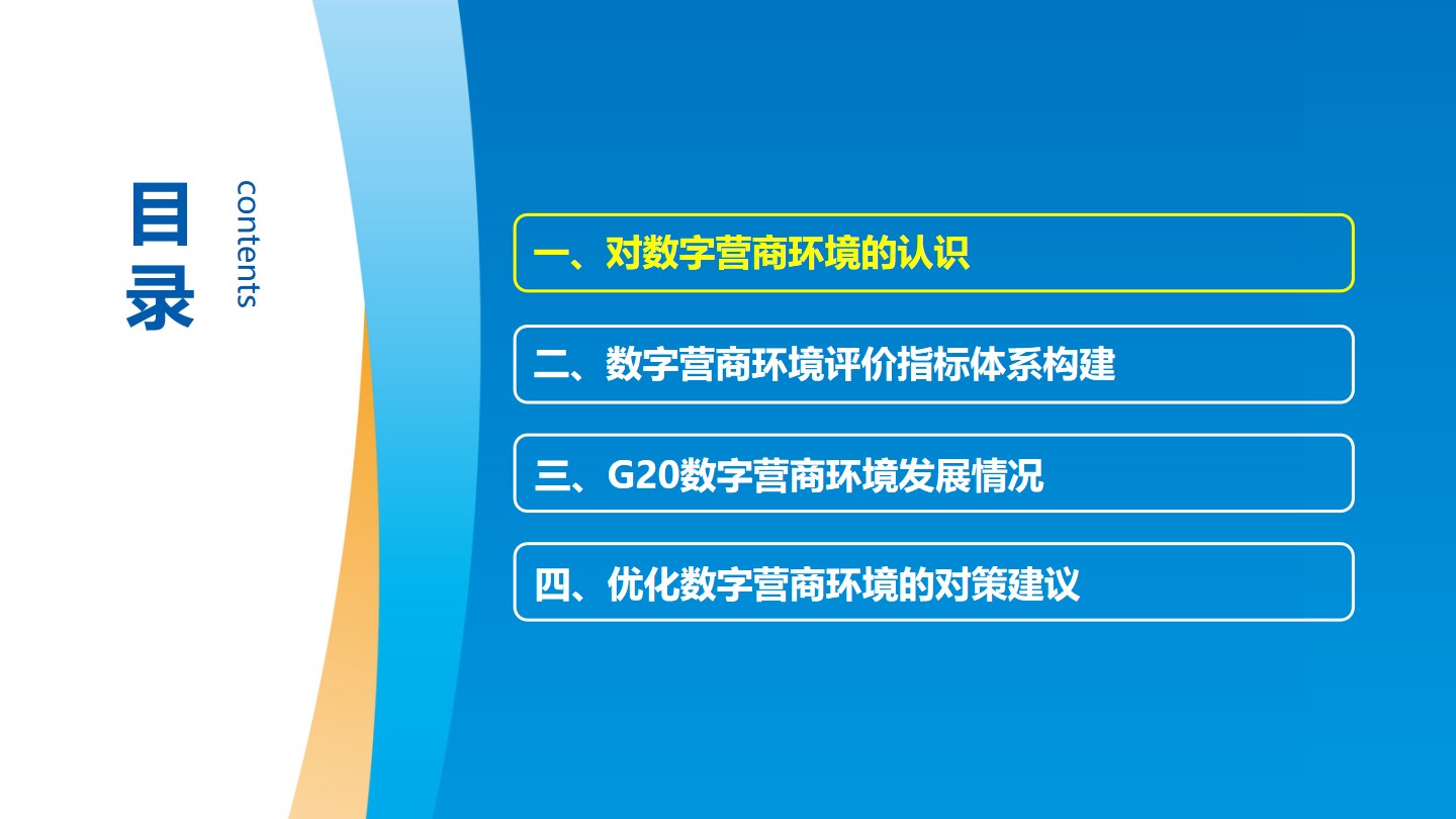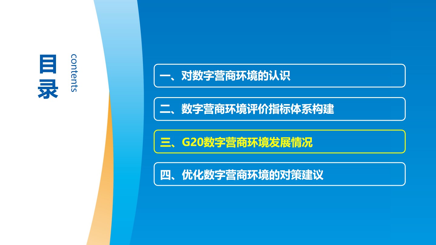 報告提出了包含數字支撐體系、數據開發利用與安全、數字市場準入、數字市場規則、數字創新環境等5個一級指標、13個二級指標、39個三級指標的全球數字營商環境評價指標體系,并對二十國集團(G20)經濟體數字營商環境進行了評價分析。結果發現,發達國家數字營商環境整體排名靠前,美國、英國、加拿大、韓國和日本位列前五;中國位列第九,是前十名中唯一的發展中國家;土耳其、印度和印尼等新興市場數字營商環境提升空間巨大,發展機遇與挑戰并存。從具體領域來看,德國數字支撐體系以微弱優勢位列第一,美國進展未如預期;美、英、沙特數據開發利用與安全位列前三,發展中國家頻頻發力數據安全;各國積極為新模式新業態的數字市場準入鋪路,在線政務極大提升了服務便利度;英國通過“市場調查”創新數字市場競爭規則,我國平臺治理政策體系持續優化;日、韓、美位列數字創新環境前三,歐盟較為注重民眾數字素養。