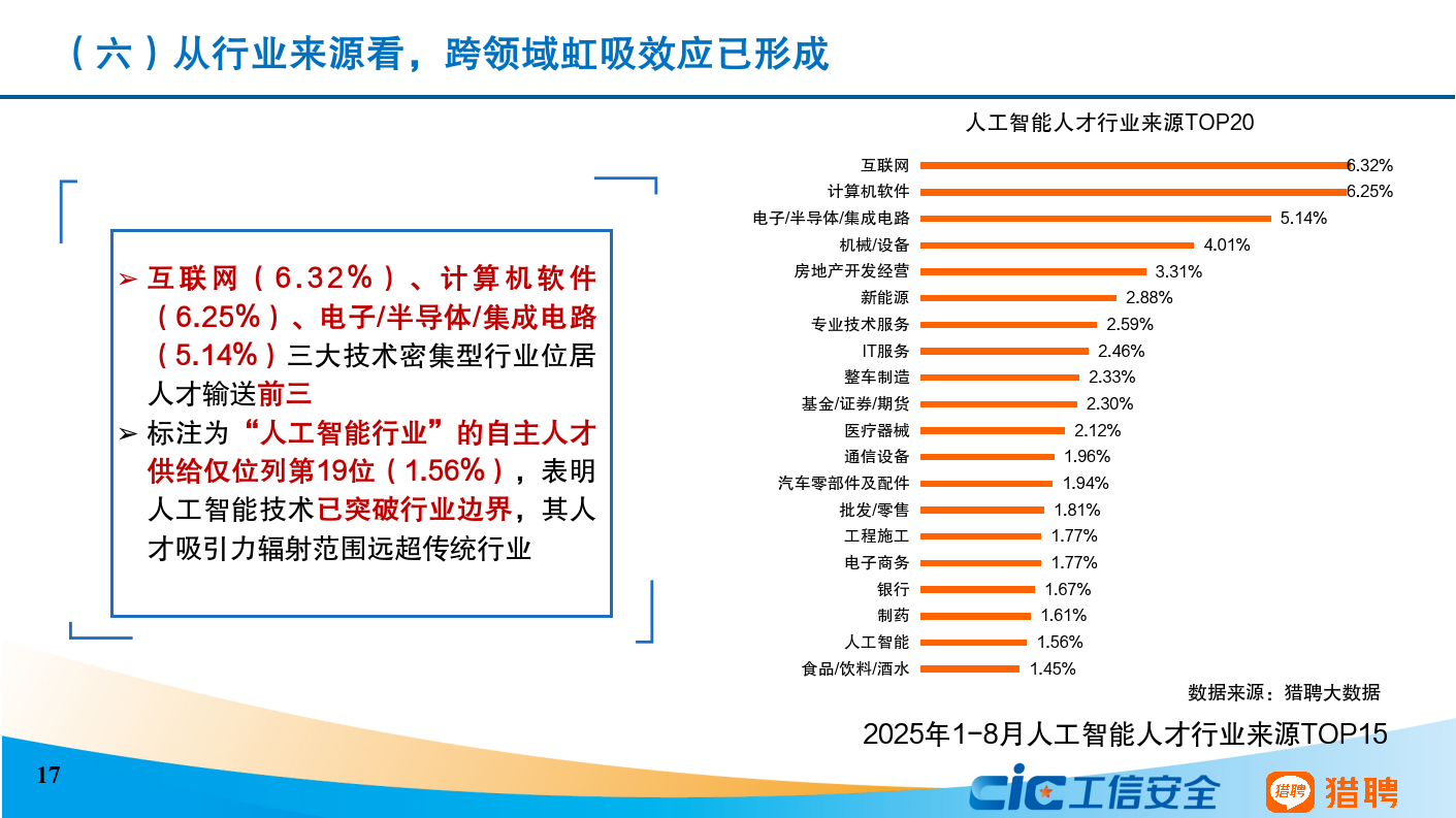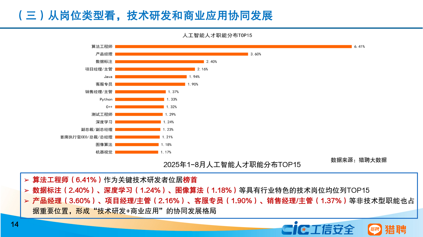 從發(fā)展態(tài)勢來看,當(dāng)前我國人工智能人才發(fā)展呈現(xiàn)六個主要特點(diǎn)。一是我國積極推進(jìn)全學(xué)段、全社會人工智能教育,以及勞動者人工智能能力建設(shè)。二是人工智能人才呈現(xiàn)學(xué)歷更高、更年輕的特征,30歲以下人員占比達(dá)45.82%,本科及以上學(xué)歷人員高達(dá)83.38%。三是技術(shù)研發(fā)和商業(yè)應(yīng)用協(xié)同發(fā)展。算法工程師崗需求占比最高,非技術(shù)型崗位需求同樣占據(jù)重要位置。四是研究型和技術(shù)型人才薪資遠(yuǎn)超平均水平,架構(gòu)師等底層技術(shù)職業(yè)的平均年薪超過人工智能行業(yè)平均水平。五是研究型和技術(shù)型人才高度緊缺。六是人工智能技術(shù)已突破行業(yè)邊界,其人才吸引力輻射范圍遠(yuǎn)超傳統(tǒng)行業(yè)。