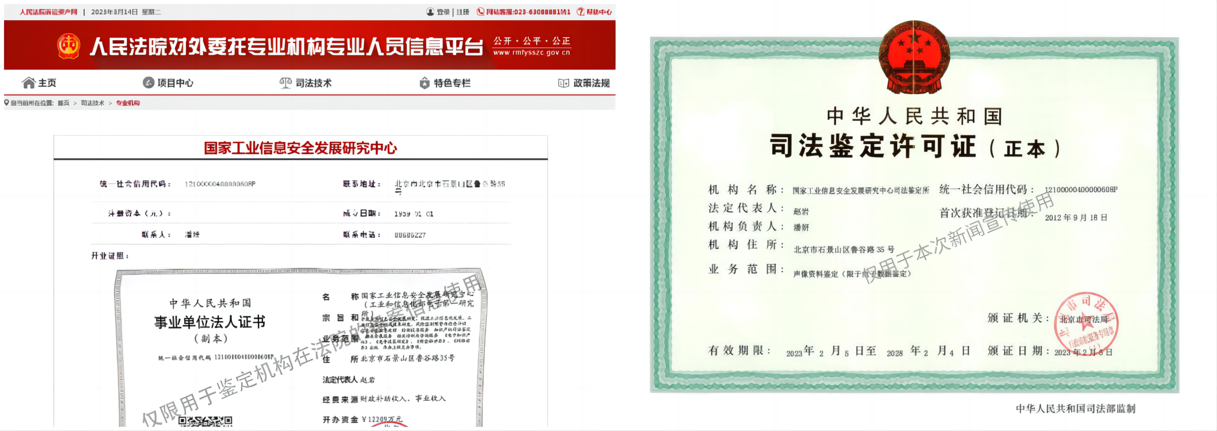 國家工業信息安全發展研究中心(以下簡稱中心)于2012年9月獲得行政許可開展司法鑒定業務,是人民法院對外委托專業機構、中國知識產權研究會知識產權鑒定專業委員會第一批入庫登記鑒定機構以及中國知識產權研究會團體標準T/CIPS 001-2022首批貫標鑒定機構,榮獲“2018-2022年度北京市司法行政系統先進集體”稱號。