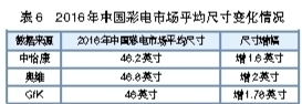 表6是各咨詢公司預估的2016年中國市場所售彩電平均尺寸以及增長情況。