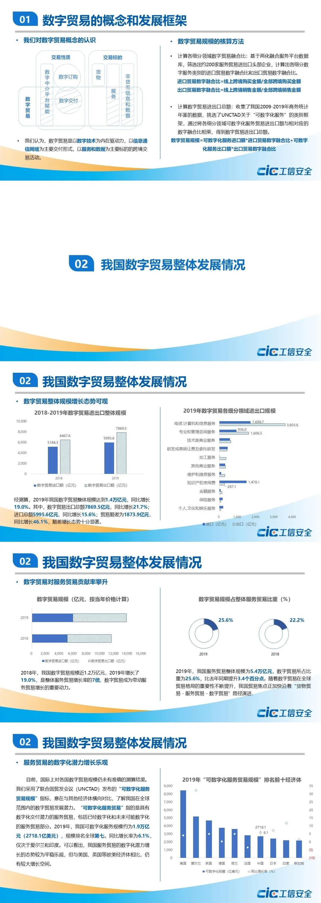 10月16日,第六場“工信安全智庫”系列成果在線發布活動“數字貿易”專場成功舉辦。國家工業信息安全發展研究中心工程師方元欣發布了《2020年我國數字貿易發展報告》。報告對數字貿易的內涵定義、發展特點、發展框架作出解讀,并基于國家工業信息安全發展研究中心兩化融合服務平臺數據庫,對2019年度我國數字貿易規模進行測度和分析,首次發布“2019年我國數字貿易規模”測算結果,同時針對現狀提出下一步發展的對策建議。