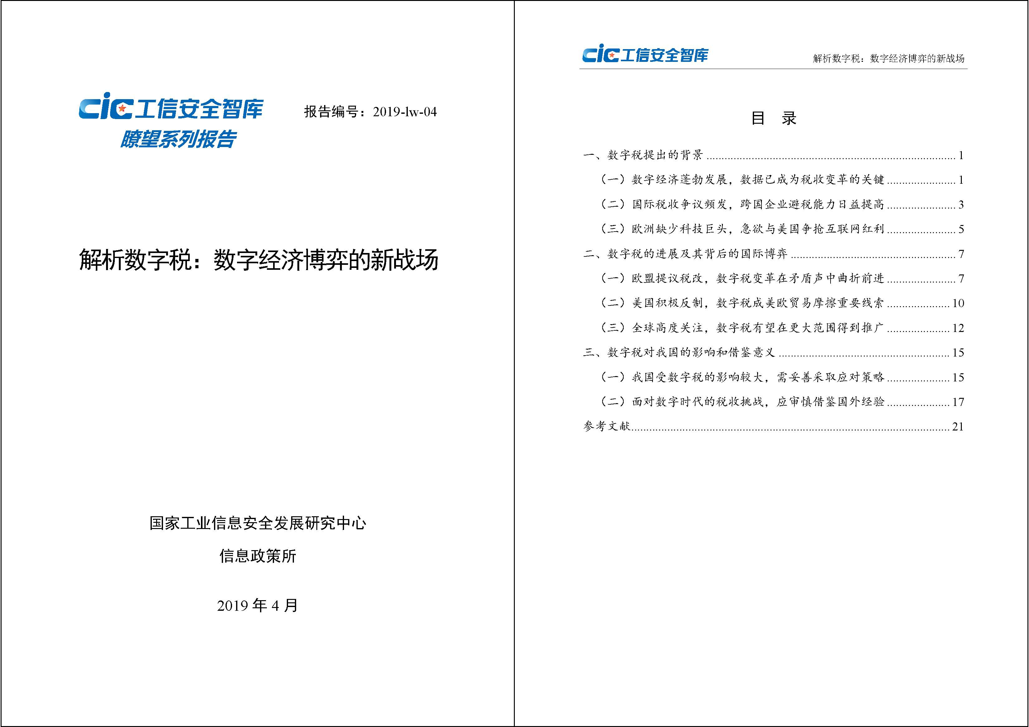 2019年4月,工信安全智庫推出“瞭望系列報告”——《解析數字稅:數字經濟博弈的新戰場》。報告主要對歐盟提出的數字稅進行研究,探討了數字稅提議的動機和背景,總結了數字稅的進展以及全球各國對此采取的立場和措施,分析了數字稅對我國的潛在影響和借鑒意義,為我國在相關領域的國際談判和稅收監管提供借鑒。
