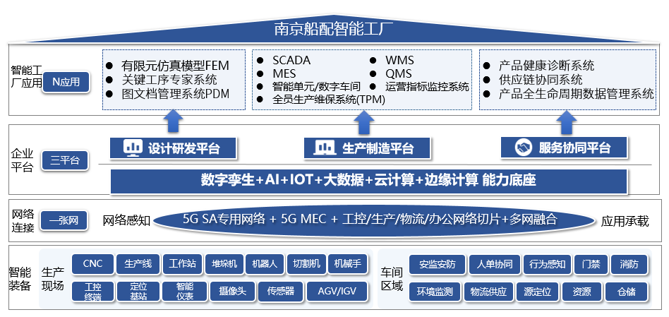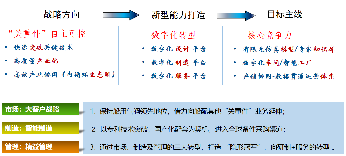 在企業(yè)資源和能力有限的條件下,南京船配聚焦高價(jià)值競(jìng)爭(zhēng)優(yōu)勢(shì),選擇“企業(yè)戰(zhàn)略目標(biāo)-優(yōu)勢(shì)需求-能力打造”目標(biāo)路徑,從業(yè)務(wù)、運(yùn)營(yíng)、組織、技術(shù)等各個(gè)要素環(huán)節(jié)的數(shù)字化改造著手,圍繞關(guān)鍵技術(shù)突破、高質(zhì)量產(chǎn)業(yè)化、供應(yīng)鏈高效協(xié)同,應(yīng)用5G等新一代信息技術(shù),開(kāi)展關(guān)鍵工序建模仿真、專家系統(tǒng)建設(shè),搭建數(shù)字化設(shè)計(jì)平臺(tái);開(kāi)展智能單元/數(shù)字車(chē)間建設(shè),搭建數(shù)字化制造平臺(tái);開(kāi)展產(chǎn)供銷(xiāo)流程信息化,搭建數(shù)字化服務(wù)平臺(tái)。全面打造設(shè)計(jì)研發(fā)、生產(chǎn)制造、協(xié)同服務(wù)能力,逐步推進(jìn)產(chǎn)品創(chuàng)新數(shù)字化、生產(chǎn)運(yùn)營(yíng)智能化、用戶服務(wù)敏捷化、產(chǎn)業(yè)體系生態(tài)化。