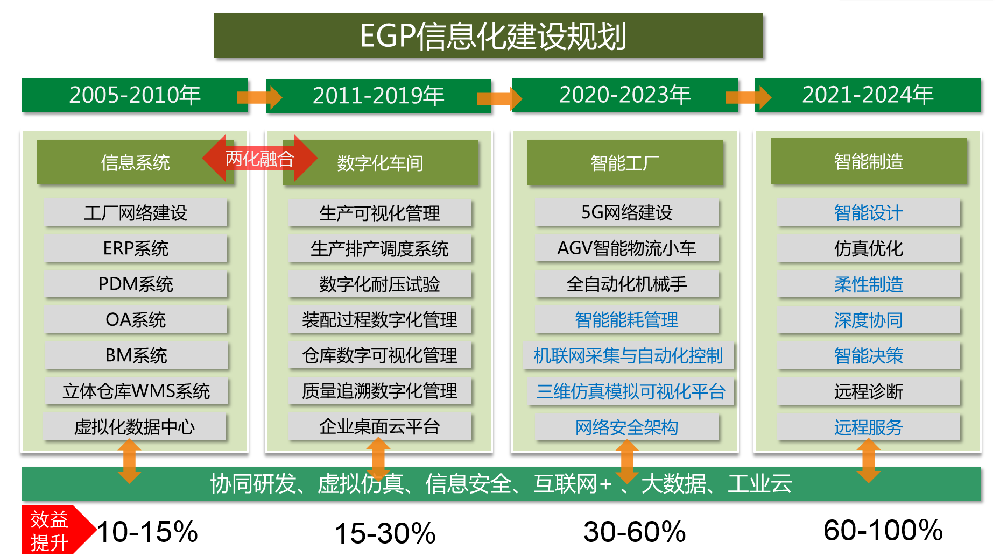 公司制定中長期數字化轉型規劃,以全面感知、泛在聯接、數據貫通、智能決策為宗旨,按設備層、單元層、車間層、企業層和協同層的五層架構推進企業數字化建設,并逐步優化迭代實現企業智能制造升級發展。公司先后引進ERP、PLM、OA、WMS、MES、Barcode、BI、CRM等信息化系統以及MAGMA、ANSYS CFD、DyRobBeS等模擬仿真系統,并在此基礎上自主開發系統平臺,以實現優質、高效、柔性、協同、綠色生產,建立全面感知、系統融合、數據貫通、智能決策、網絡協作的智能工廠。