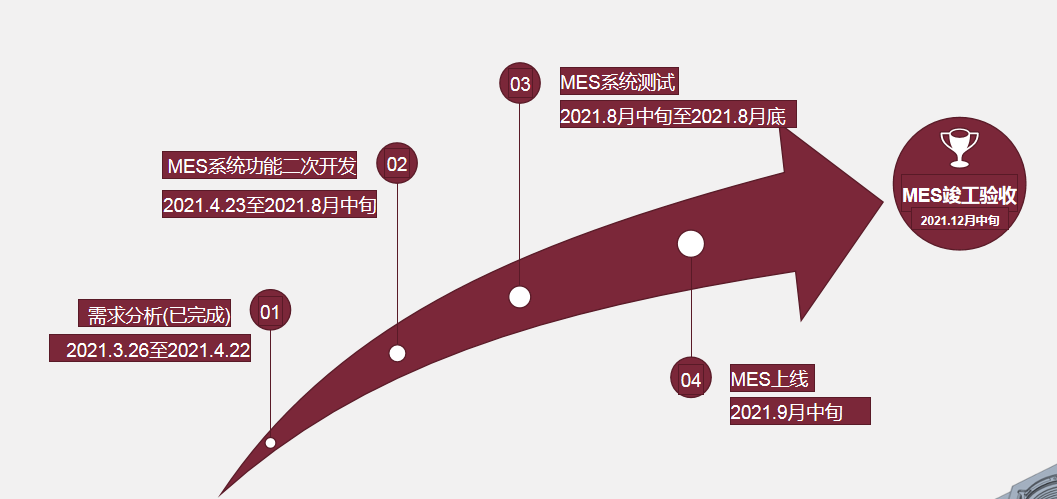 三是從MES系統功能二次開發到MES測試階段階段,將MES系統與ERP的接口準備好,為后面ERP與MES的數據傳遞做好準備。同時MES開發進度每周匯報一次,不斷推進。