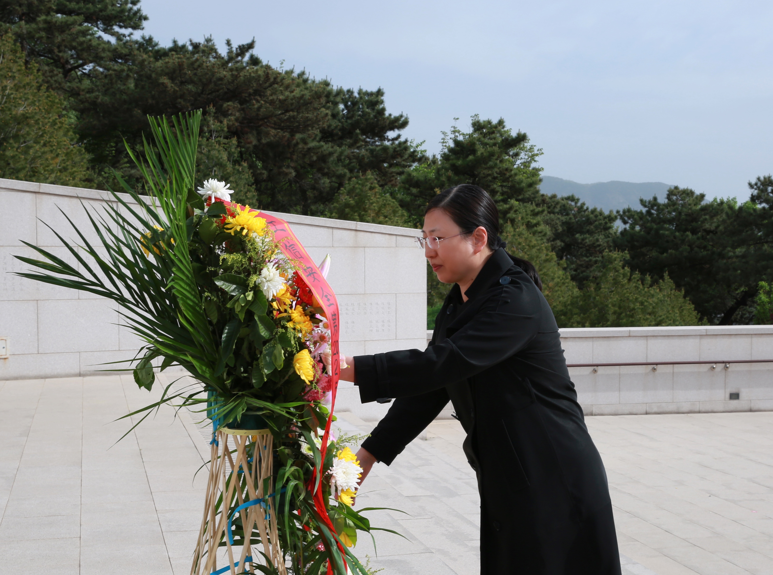 黨員同志為無名英雄敬獻花籃,謝雨琦整理花籃上的緞帶。全體人員向英雄們敬獻鮮花。