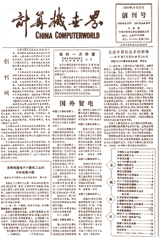 歷經申請、批復、注冊、核準等多番周折,1980年9月,電子一所與美國國際數據集團(IDG)最終正式簽訂協議,共同成立了“中國計算機世界出版服務公司”,這是當時全國范圍內第18家中外合資公司,也是新聞出版界第一家合資公司。10月28日,《計算機世界》創刊號出版面世,并逐步從創刊初期的半月報,每期16版,發行量2萬份,很快發展成為周報,每期200版左右,最多達340版,發行量突破20萬份。其覆蓋面之廣、信息量之大,為業界所稱道。
