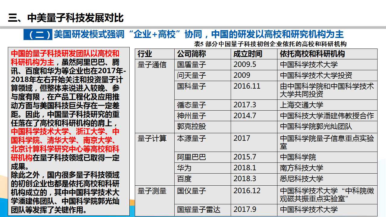 報告認為,我國與美國量子科技發展各有所長:美國在量子計算領域領先,中國在量子通信領域領先;美國研發模式強調“企業+高校”協同,中國的研發以高校和研究機構為主;美國量子投資大多是“政府”+“風投”的雙線聯動,中國仍需帶動風投市場加大投資;美國注重擴大基礎人才數量,中國注重培養尖端團隊。報告指出,中國量子科技發展仍面臨量子計算核心技術較落后、量子通信產業鏈上下游實力不均、量子科技人才數量不足等風險,亟須加強頂層設計和國家統籌,提高對量子科技發展的跟蹤與研究,加快基礎研究和關鍵核心技術的攻關,打造產學研用協同創新網絡,培養量子科技領域的基礎人才和尖端團隊。