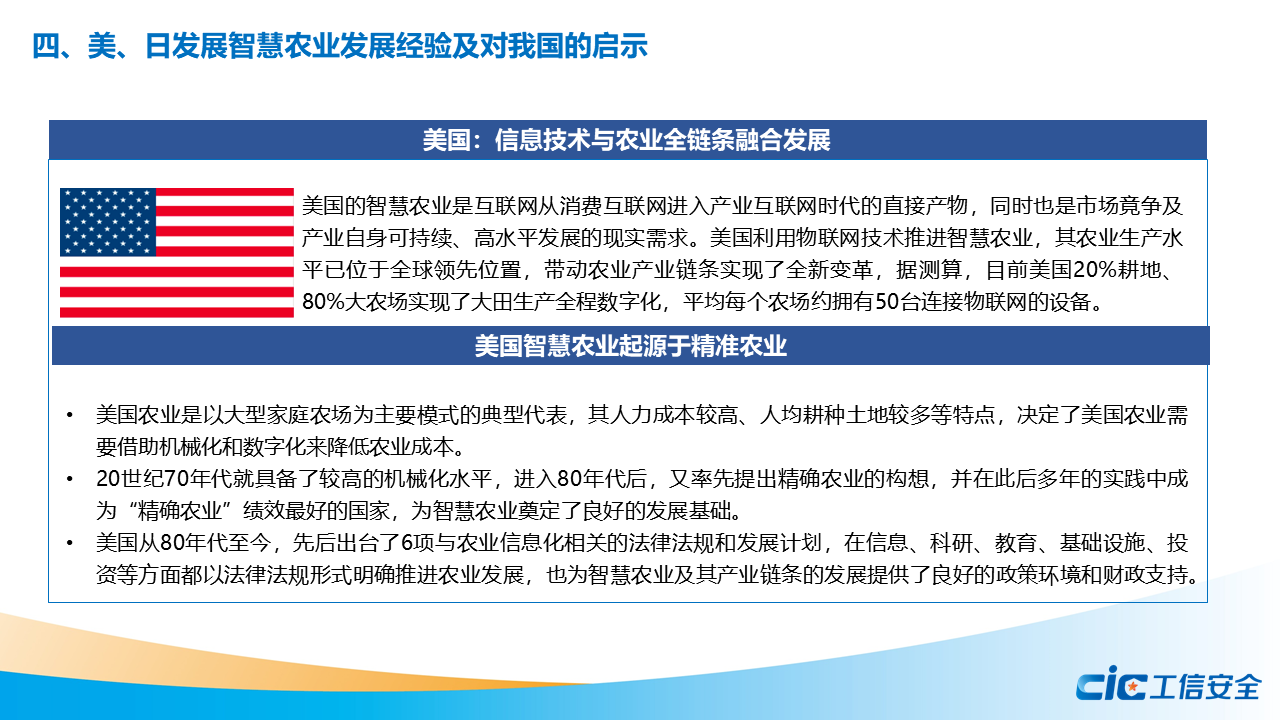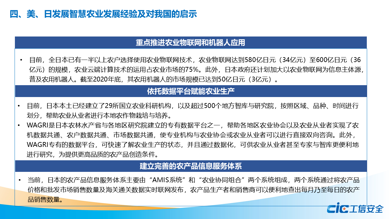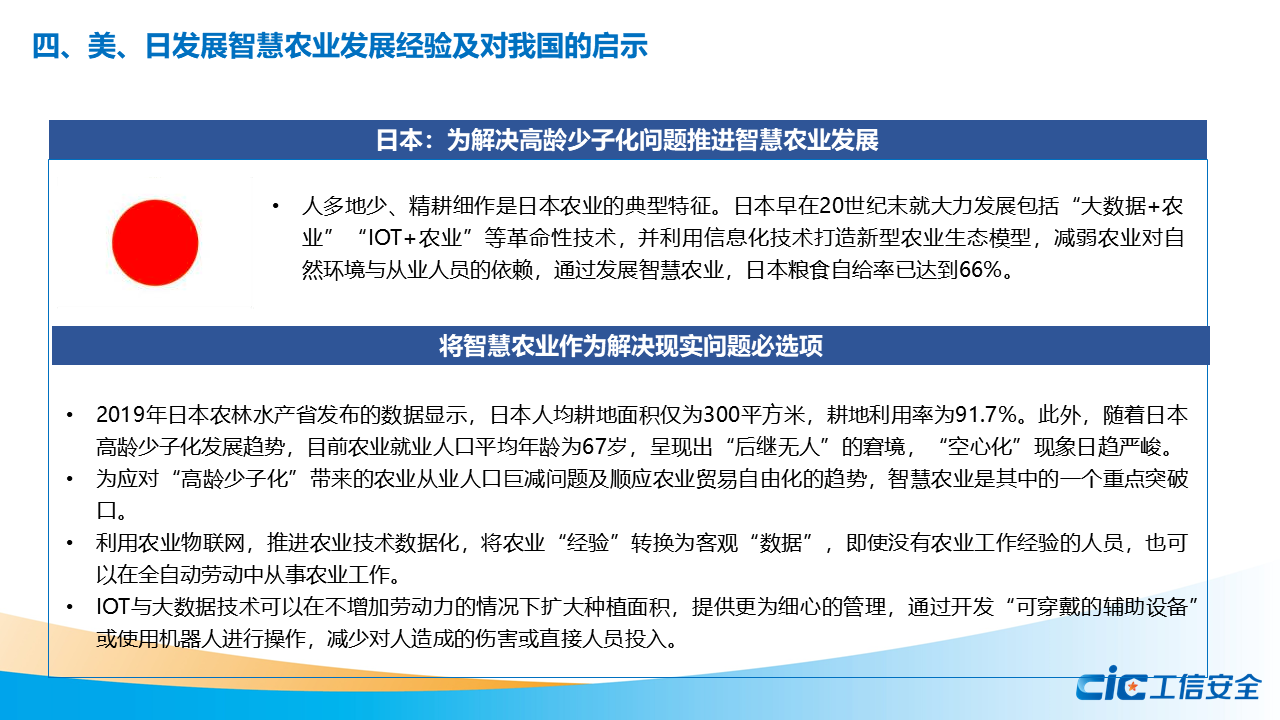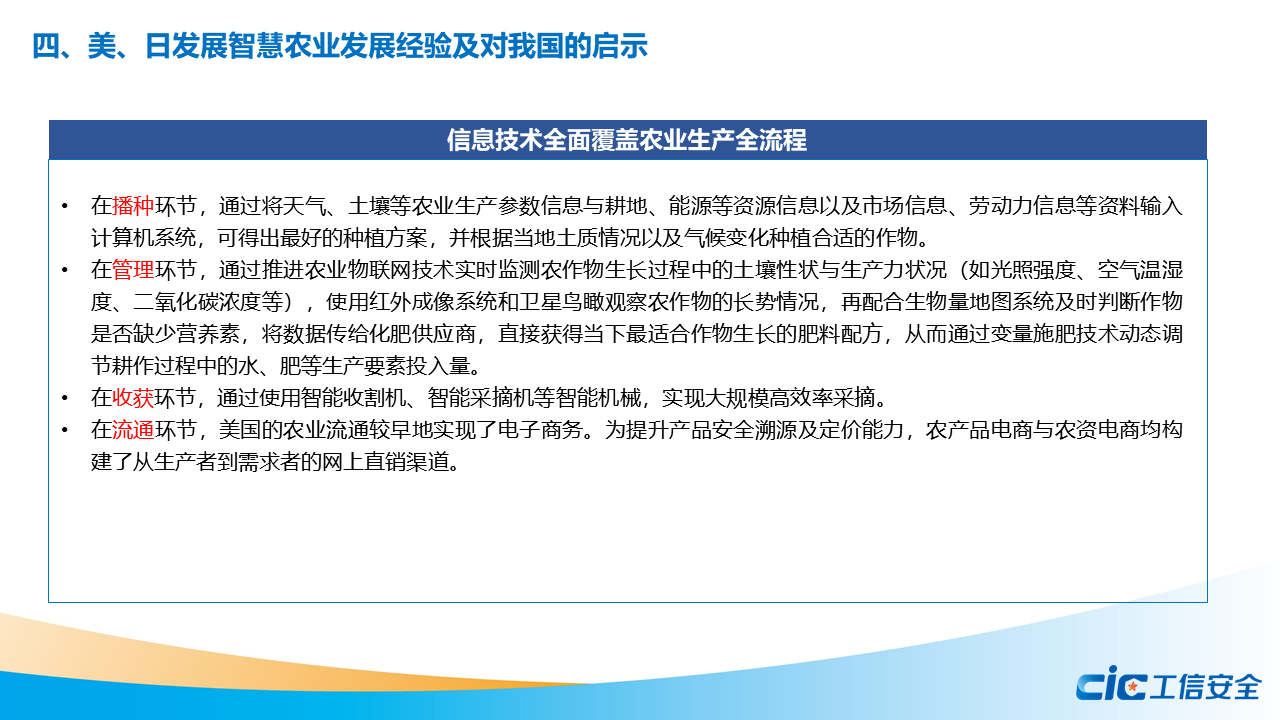 報告提出,美、日兩國結(jié)合自身情況積累了豐富的智慧農(nóng)業(yè)發(fā)展經(jīng)驗。美國通過全面推進(jìn)信息技術(shù)與農(nóng)業(yè)全鏈條融合發(fā)展,在種植、管理、收獲、流通等環(huán)節(jié)均通過物聯(lián)網(wǎng)、農(nóng)業(yè)大數(shù)據(jù)、電子商務(wù)等措施,打造了全閉環(huán)式的智慧農(nóng)業(yè)發(fā)展模式。日本農(nóng)業(yè)面臨從業(yè)人口老、后繼無人等困境,通過推進(jìn)智慧農(nóng)業(yè)發(fā)展,利用信息化技術(shù)打造新型農(nóng)業(yè)生態(tài),大大降低農(nóng)業(yè)對自然環(huán)境與從業(yè)人員的依賴。為促進(jìn)我國智慧農(nóng)業(yè)更好發(fā)展,仍需要充分結(jié)合我國農(nóng)業(yè)發(fā)展特點,打造相應(yīng)的農(nóng)業(yè)智能裝備,打通農(nóng)業(yè)數(shù)據(jù)壁壘。