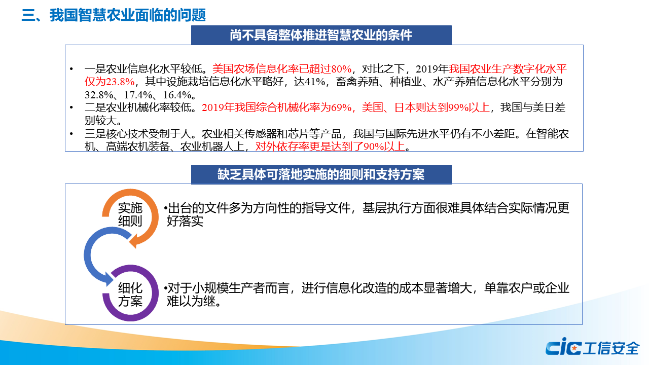 報告認(rèn)為,伴隨網(wǎng)絡(luò)扶貧、電信普遍服務(wù)、電子商務(wù)進(jìn)農(nóng)村等措施落地實施,我國智慧農(nóng)業(yè)發(fā)展基礎(chǔ)不斷夯實,農(nóng)村光纖和4G覆蓋率均超過OECD平均水平,農(nóng)業(yè)物聯(lián)網(wǎng)、農(nóng)業(yè)大數(shù)據(jù)得以廣泛應(yīng)用。但總體上來看,我國智慧農(nóng)業(yè)仍處于起步階段,仍存在明顯短板,尚不具備整體推進(jìn)智慧農(nóng)業(yè)的條件,缺乏具體可落地實施的細(xì)則和支持方案,數(shù)據(jù)資源尚未完全打通,對于智慧農(nóng)業(yè)本身認(rèn)知仍有不足。