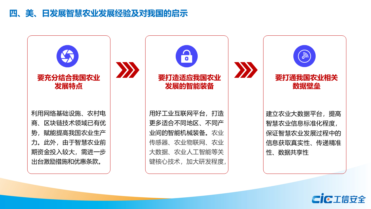 報告建議,借鑒國外經(jīng)驗,一是多措并舉推進(jìn)智慧農(nóng)業(yè)發(fā)展,出臺更加具體政策能夠幫助當(dāng)?shù)卮蛟爝m合的智慧農(nóng)業(yè)發(fā)展模式,加強(qiáng)資金保障,為智慧農(nóng)業(yè)發(fā)展提供必備資金,強(qiáng)化人才支撐,為智慧農(nóng)業(yè)發(fā)展及創(chuàng)新提供充足的人才資源。二是提升農(nóng)業(yè)科技研發(fā)和應(yīng)用水平,強(qiáng)化推進(jìn)核心技術(shù)研發(fā)和裝備研發(fā),構(gòu)建農(nóng)業(yè)科研技術(shù)創(chuàng)新平臺,推進(jìn)“產(chǎn)學(xué)研”有效結(jié)合。三是強(qiáng)化強(qiáng)化新基建和國產(chǎn)裝備應(yīng)用能力,加快農(nóng)業(yè)新基建建設(shè),引導(dǎo)農(nóng)戶使用國產(chǎn)農(nóng)業(yè)機(jī)械和裝備,完善農(nóng)業(yè)公共信息服務(wù)體系。四是做好宣傳和推廣,及時總結(jié)推廣智慧農(nóng)業(yè)先進(jìn)經(jīng)驗,加強(qiáng)交流,營造全社會關(guān)心智慧農(nóng)業(yè)發(fā)展的良好氛圍。