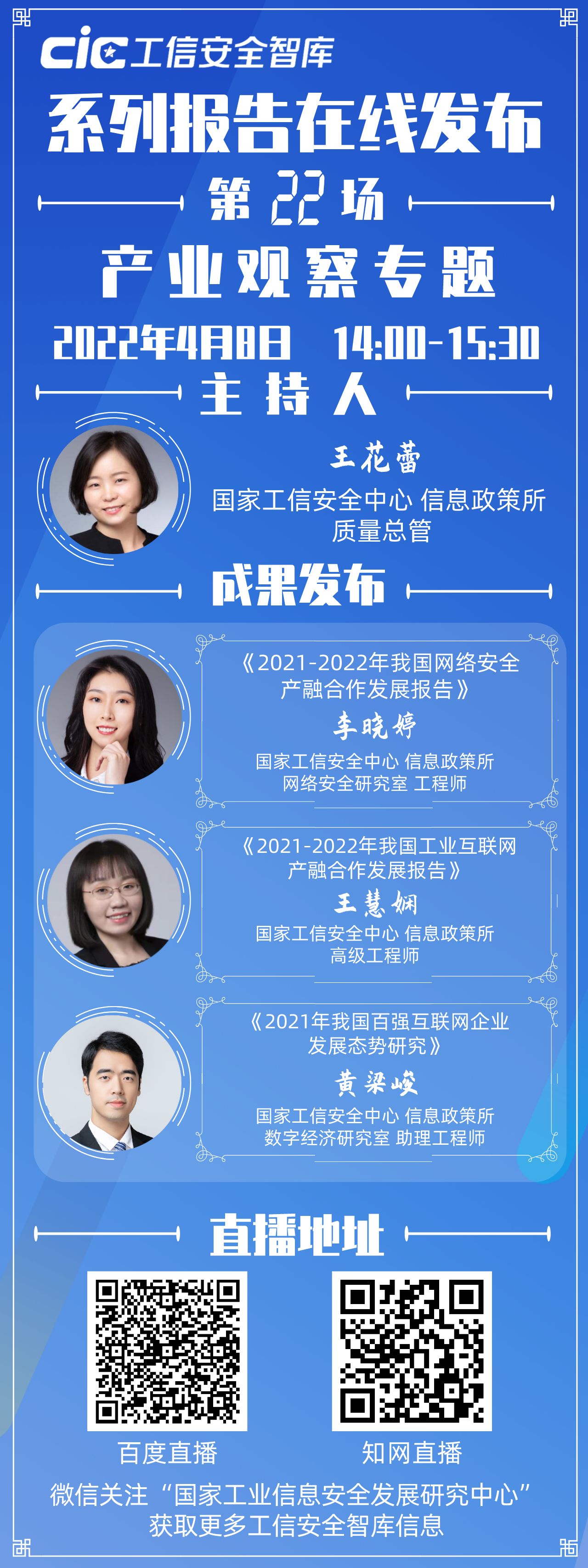 第二十二場“工信安全智庫”系列報告在線發布活動將于本周五(4月8日)下午2:00準時上線。本次發布活動以“產業觀察”為主題,發布《2021-2022年我國網絡安全產融合作發展報告》《2021-2022年我國工業互聯網產融合作發展報告》和《2021年我國百強互聯網企業發展態勢研究》三份報告。發布活動將由中心信息政策所質量總管王花蕾主持。