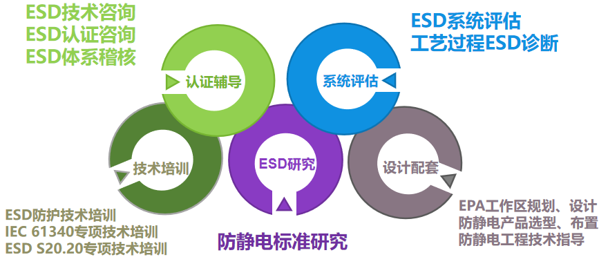 同時提供多方位防靜電領域技術咨詢,包括標準研究及推廣、ESD技術和管理培訓、ESD系統評估及診斷支持等。
