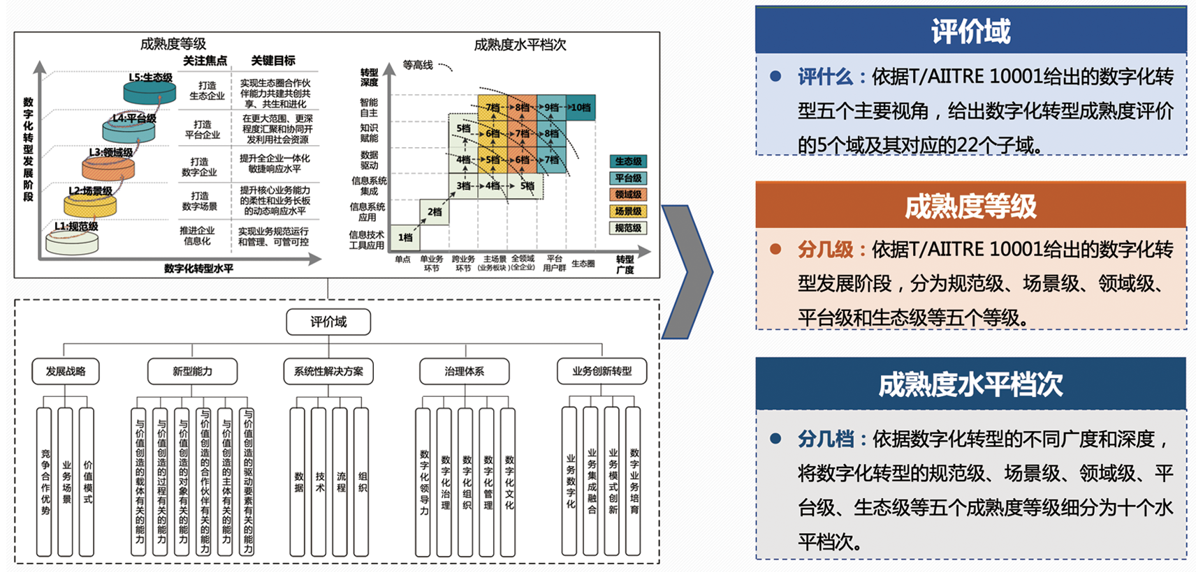 面向制造企業,依據T/AlITRE 10004《數字化轉型成熟度模型》,幫助企業從全 局層面系統把握轉型規律,精準定位數字化轉型成熟度等級和水平檔次,明確向更高 發展等級和水平檔次躍升的方向和路徑。