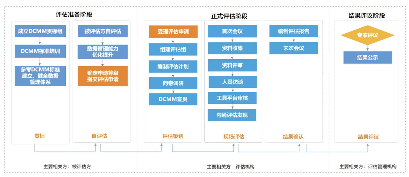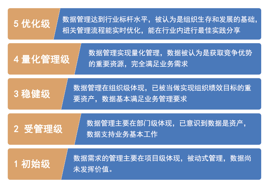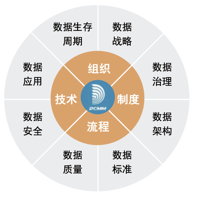 《GB/T36073-2018 數據管理能力成熟度評估模型》,(簡稱: DCMM), 結合數據 生命周期管理各個階段的特征,對數據管理能力進行了分析、總結,提煉出組織數據 管理的八大能力域(數據戰略、數據治理、數據架構、數據標準、數據質量、數據安全、 數據應用、數據生存周期),二級能力項(28個能力項)和成熟度等級的劃分(5個等 級)以及相關功能介紹和評定指標(445項指標)。